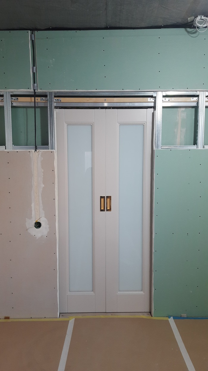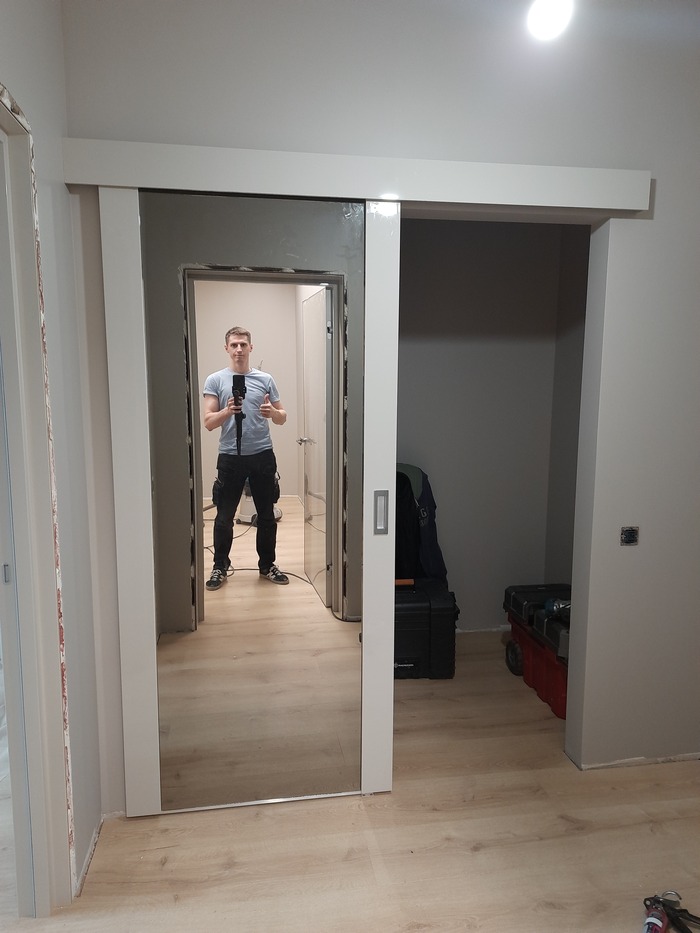 Со съёмной квартиры переехал какой-то минимум мебели. Были докуплены стеллажи и самое основное для минимального комфорта. Детская и спальня были в процессе отделки, поэтому временно приходилось спать на кухне.