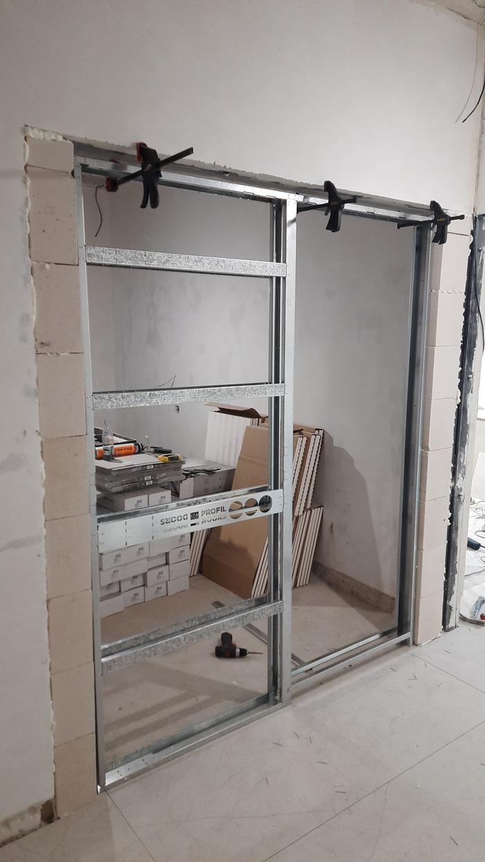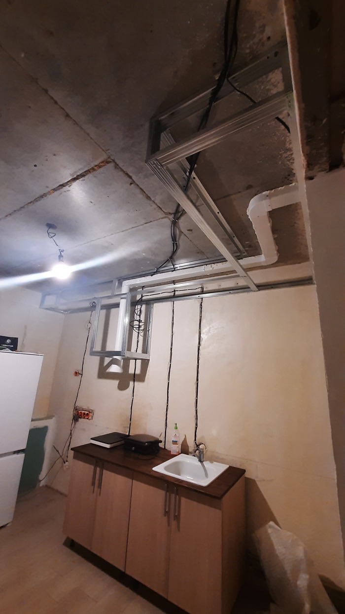 Подготовил каркас и провёл вытяжку. Вывел от щитка кабель под бытовую технику. Чтобы не готовить на коленке, купил и собрал мини-кухню.