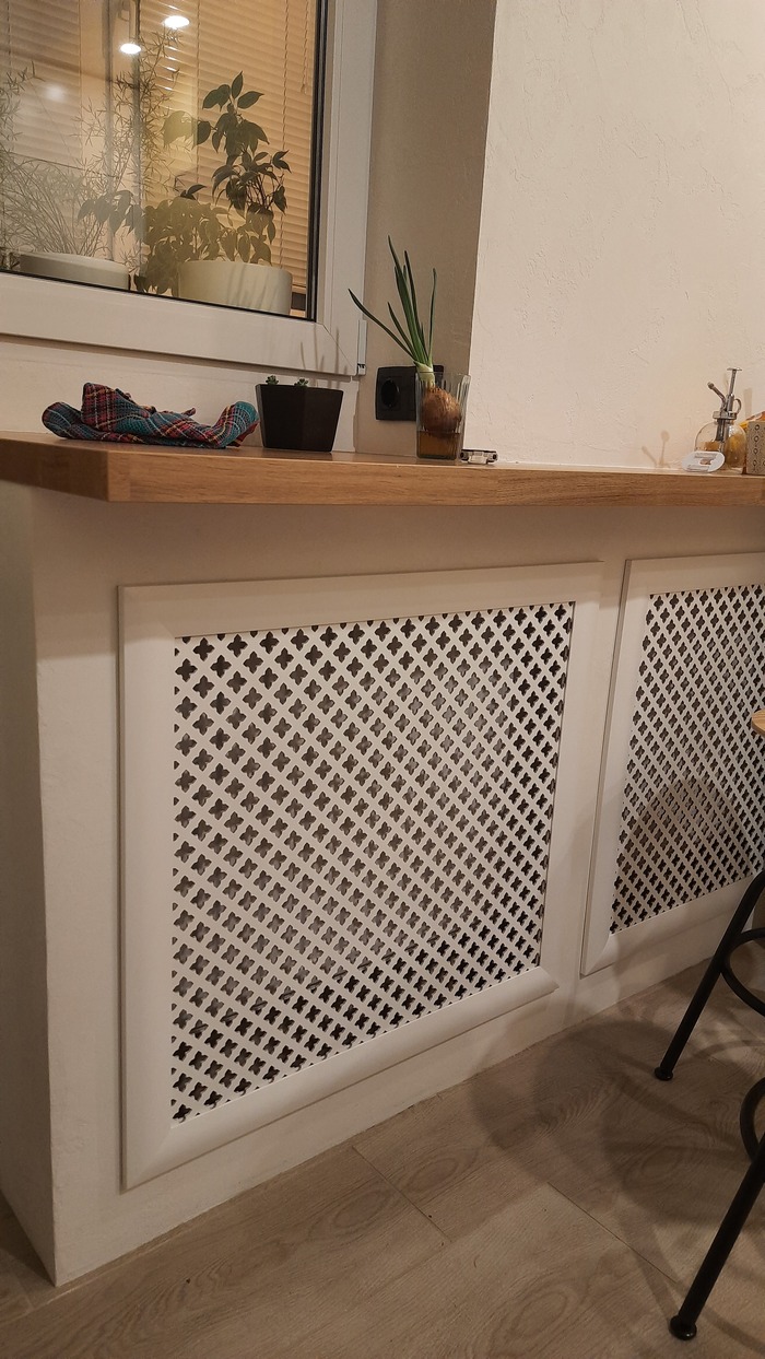 Сам изготовил декоративные решётки по своим размерам. Покрыл матовой эмалью. Крепёж быстросъёмный на магнитах.