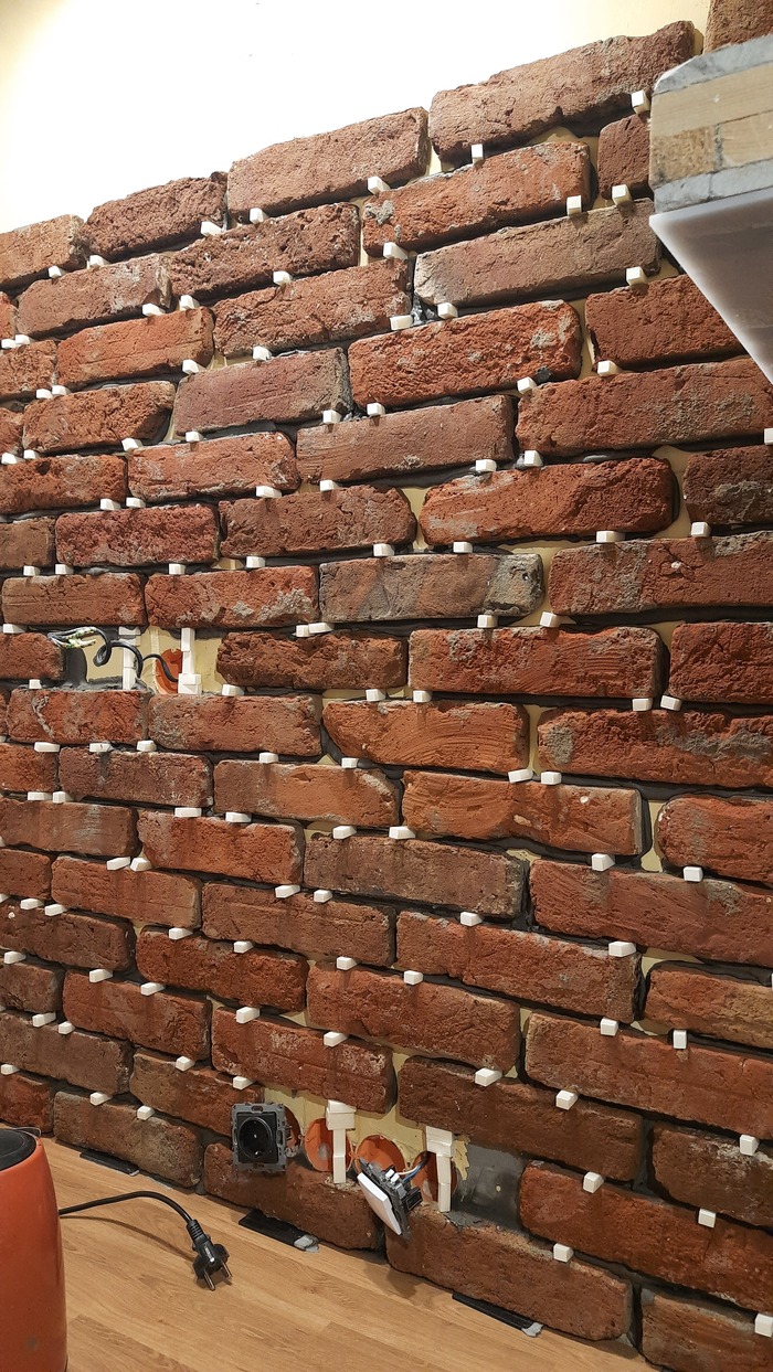 Почти закончил. Углы запилил под 45. Залил герметиком в цвет. Пыль от кирпича смешал с матовым акриловым лаком и покрыл углы. Тем самым добился эффекта кирпичной кладки.