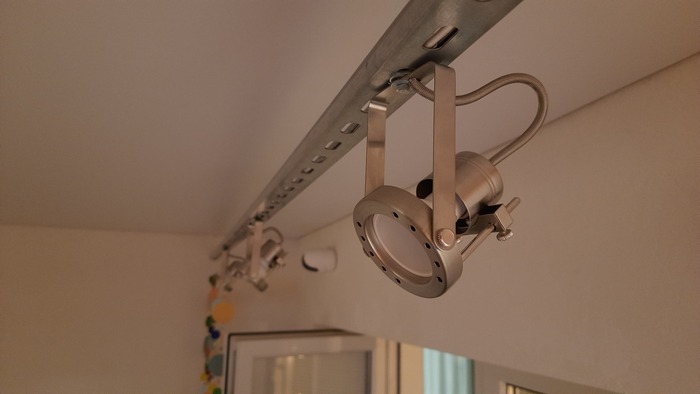 В финале ремонта кухни одна известная российская торговая площадка подвела с освещением. Как оказалось, освещение в цвете "сатин" обладает самым скудным разнообразием. В зелёном магазине была куплена люстра и хладнокровно разобрана на элементы. Лишние запчасти утилизированы, а то, что нужно, установлено в трек. Цель была создать трековую систему, как в производственных помещениях. Немного грубо, но в сторону современного исполнения.