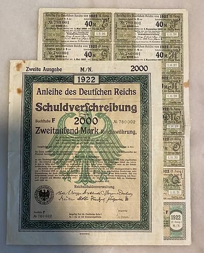 Эта облигация Второго выпуска 1922 года номиналом в 2000 марок — не финансовый инструмент, а физическое свидетельство экономического коллапса. Выпущенная всего через четыре года после поражения в войне и Версальского договора, она представляет собой отчаянную попытку Веймарской республики найти хоть какие-то ресурсы в условиях нарастающей катастрофы. Инвестор, купивший её, вкладывался не в будущее, а в отсрочку неизбежного — выплату неподъёмных репараций и финансирование парализованного хозяйства.