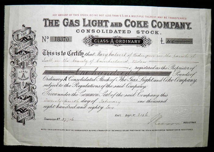 Перед нами не просто старинная акция, а материальное свидетельство целой технологической эпохи, навсегда изменившей облик городов и быт людей. «The Gas Light and Coke Company» — это имя, которое было синонимом прогресса для лондонцев XIX века.