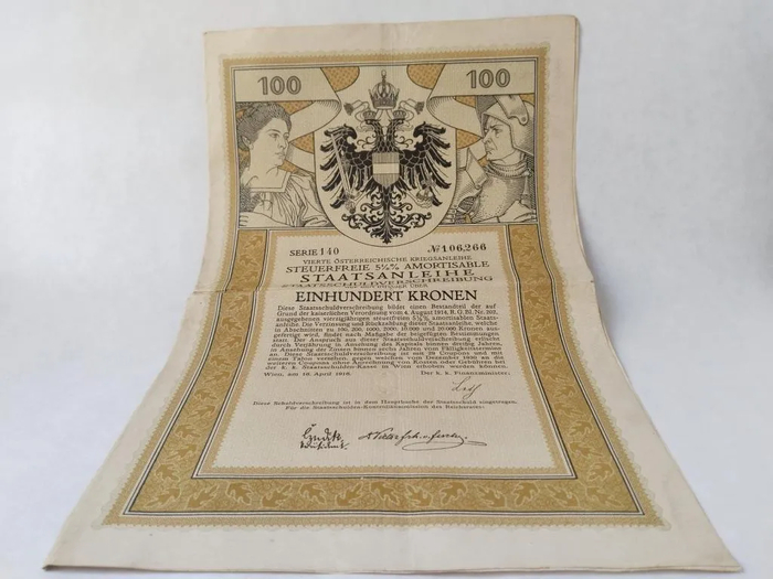 Эта облигация в 100 крон — финансовый снимок империи на грани нервного срыва. Выпущенная в 1914 году с обещанием 5% годовых и полного погашения, она стала одним из последних внутренних займов двойной монархии. Её главная гарантия — шестивековая династия Габсбургов — пережила этот выпуск меньше чем на четыре года. Интересно, что для скрепления австрийской и венгерской половин империи использовалась единая валюта — крона, заменившая в 1892 году прежние гульдены и форентины. Но эта финансовая уния оказалась такой же хрупкой, как и политическая.