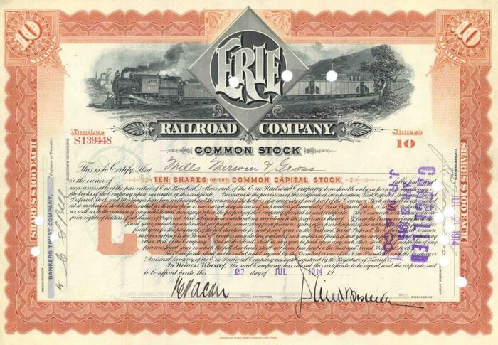 10 акций акционерного общества «Railroad Company» 1914 года — это сгусток финансовой истории, застывший на пике могущества стального пути. К моменту её выпуска железные дороги достигли апогея: в США их протяжённость превысила 250 000 миль, что было больше, чем во всём остальном мире. Эта акция была инвестицией в абсолютного монополиста сухопутных перевозок, в инфраструктуру, которая не просто связывала города, а создавала их, определяла стоимость земли и диктовала темп промышленного роста. Именно способность железных дорог за считанные дни перебрасывать миллионы солдат сделала начавшуюся в том же году Первую мировую войну первой в истории «рельсовой» войной, демонстрируя их стратегическое значение.