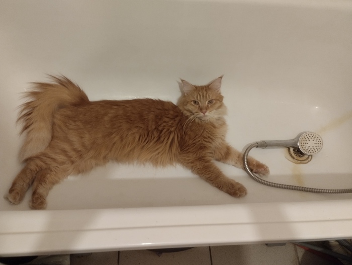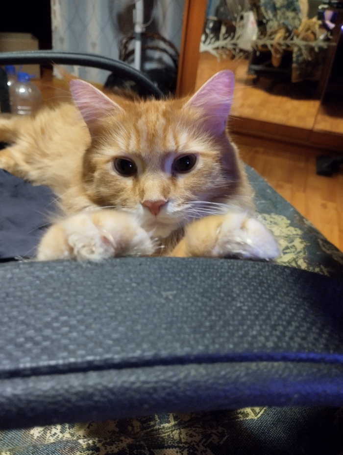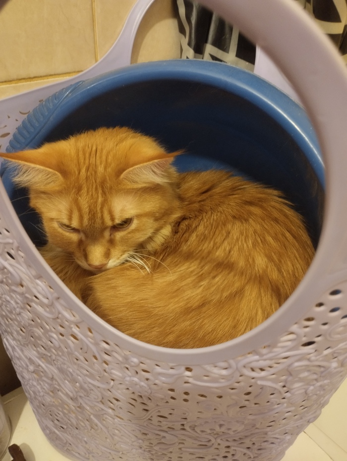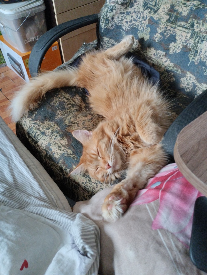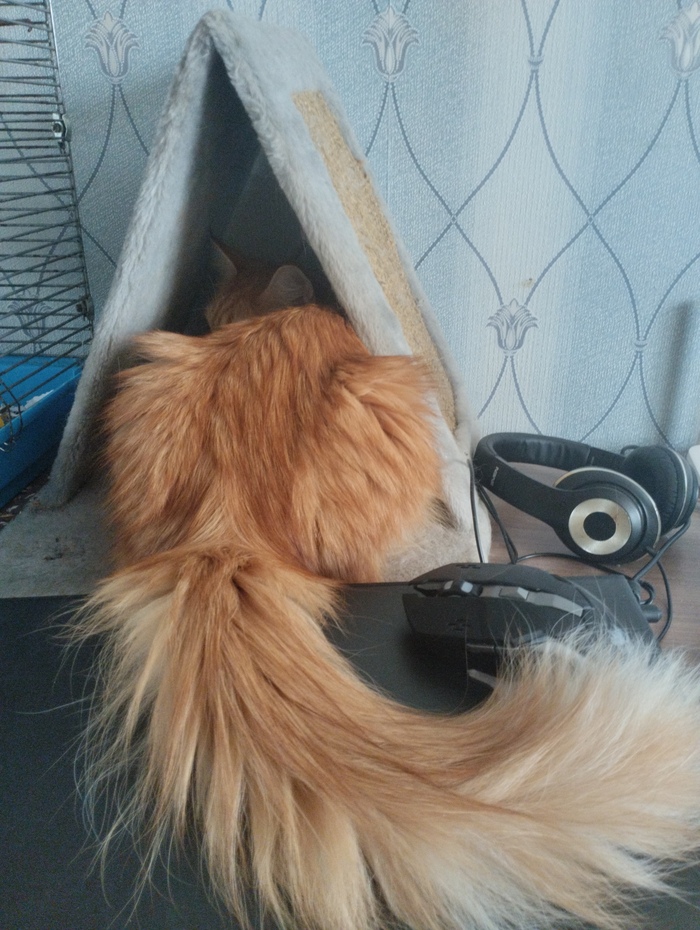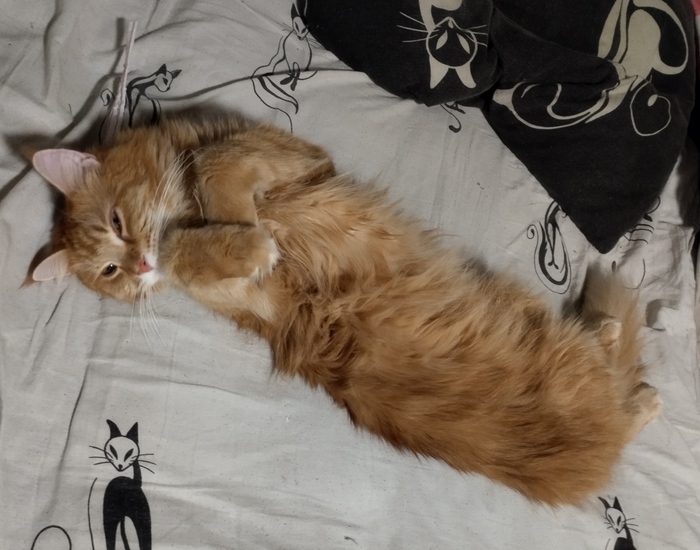Приёмный сын, мохнатых кровей, очень редко даёт ей поспать рядом с собой, блаженствуя от тепла и осязания роскошного меха. Зато заставляет держать себя в форме - побегушки за стыренной коктейльной трубочкой или маминой резинкой для волос: святая святых каждого уважающего себя котика)