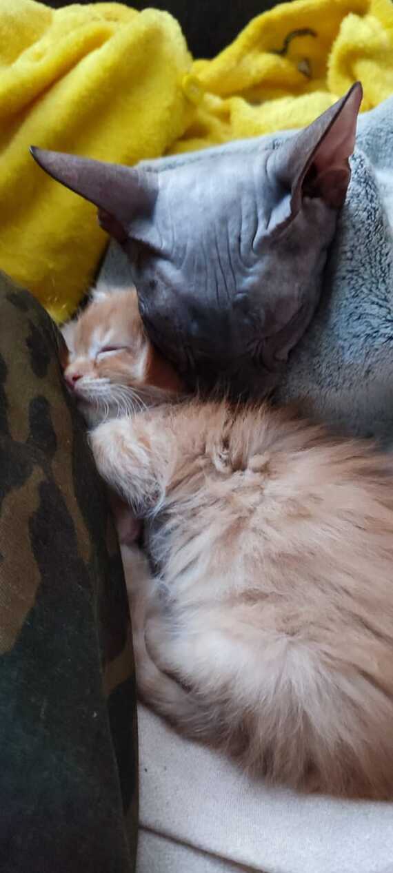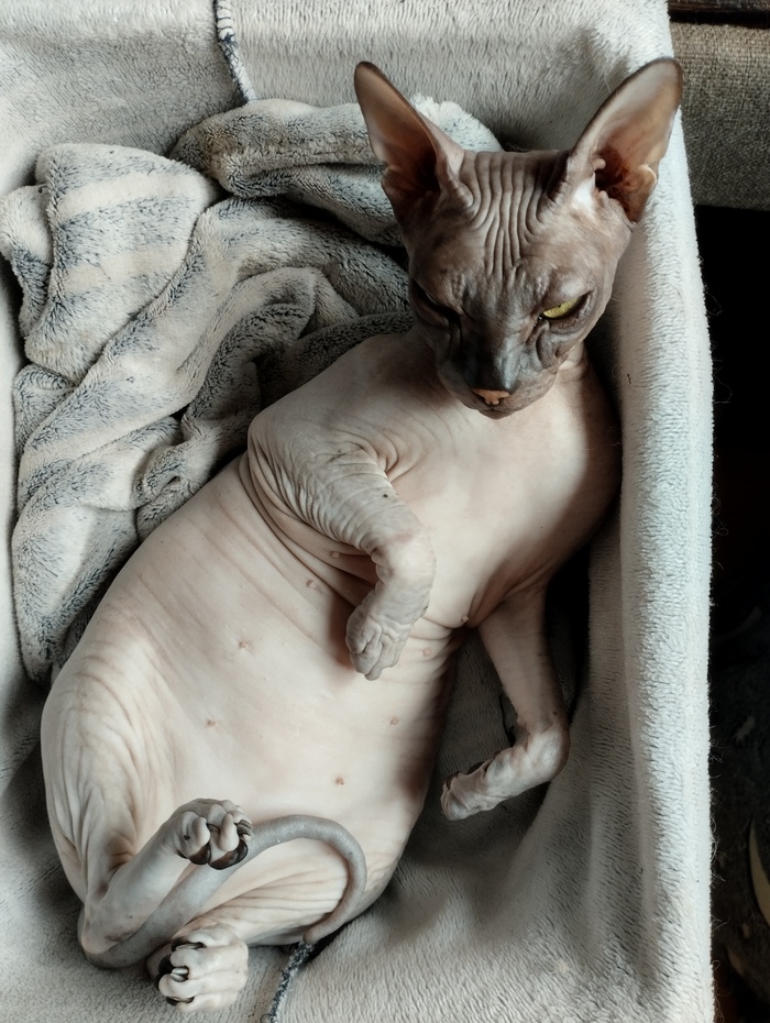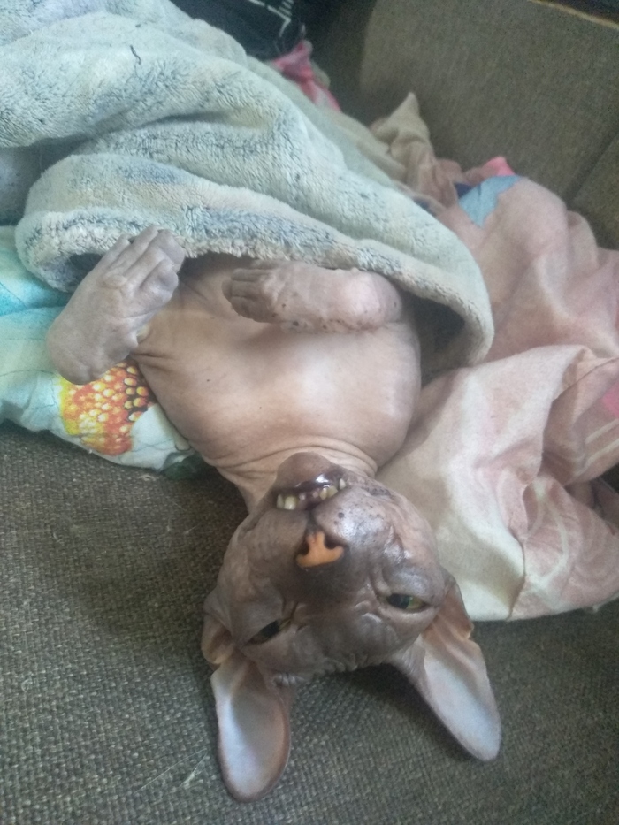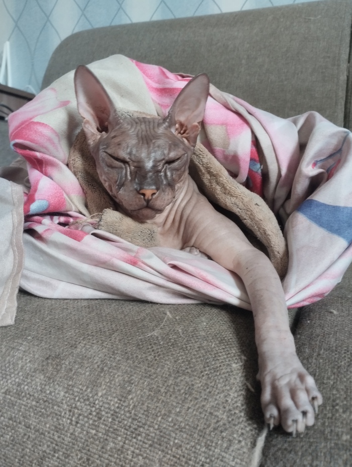 В 2019 году, можно сказать, на последние деньги, я взяла маленькое лысое чудо. Когда приехала её забирать - вышла хозяйка, а на её груди, всеми четырьмя лапами, выпустив коготки, как морская звезда, висела моя Исида) Она лысая, но "беспородная", как вопят умные фелинологи - мне по барабану чьих кровей моя кошка, раз лысая - значит сфинкс, а раз сфинкс и мой хозяин идиот - то почему-то имя, по классике египетское)))
