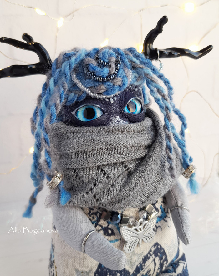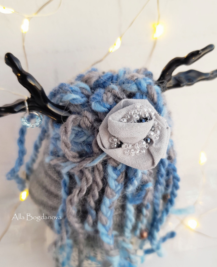 Текстильная игрушка выполнена из льняной и хлопковой ткани. Шарфик из хлопкового трикотажа. Глазки стеклянные. Прическа сплетена из полушерстяной пряжи, заколка-брошь в виде розочки. Лапки на пуговичном креплении. Украшена бисером, бусинами гематита и стеклянными гранеными бусинами. Набивка холлофайбер. В высоту около 13 см не считая рожек.