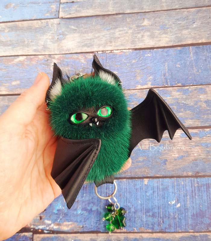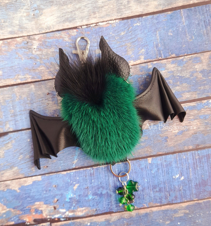 Приветствую! Сегодня покажу мышку, которую сшила на заказ в прошлом месяце. Нужно было непременно из меха зелёного цвета, глазки подобрала тоже яркие, светло-зелёные. Стеклянные бусины в цвет и потом добавила к ним металлическую подвеску в виде гитары. Мышка для девушки любительницы рок-музыки, поэтому ирокез и серьги в ушах) Крылья подвижные, на проволочном каркасе, размах около 15 см. Длина тела вместе с ушками около 10 см. В таком цвете это единственный экземпляр, повторять не планирую.