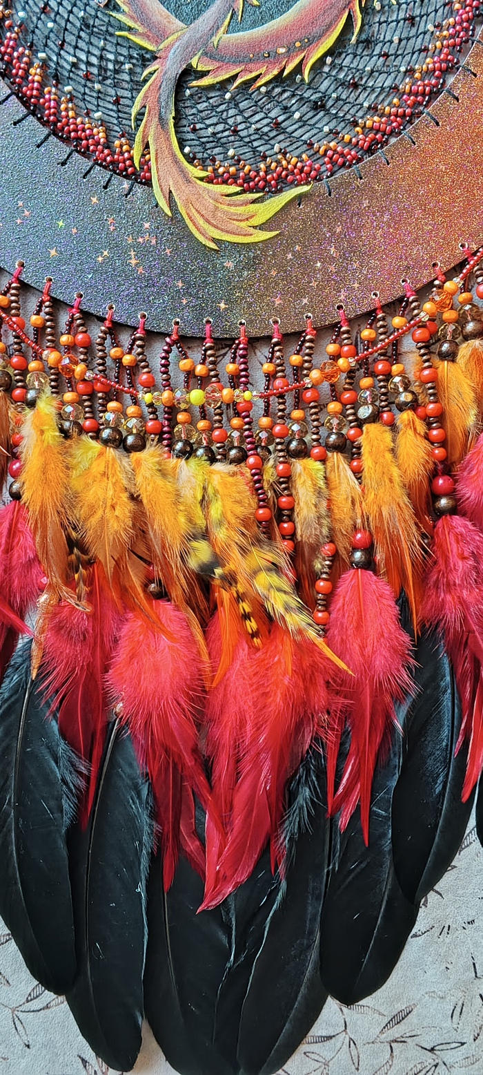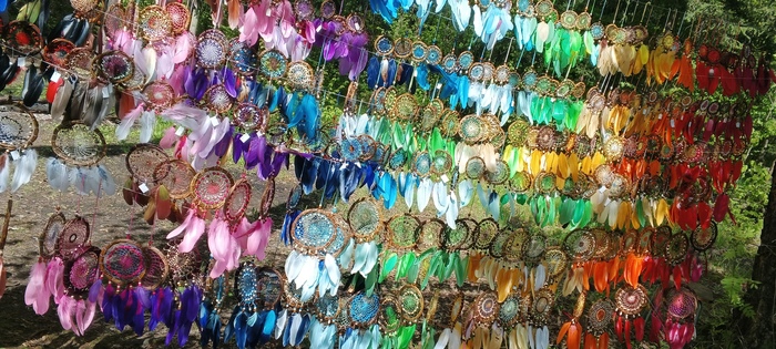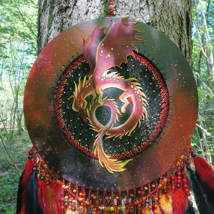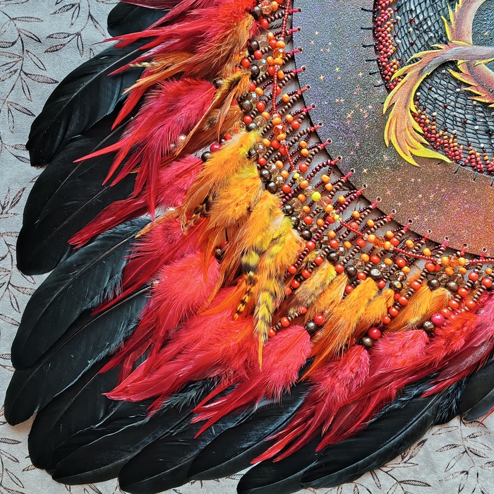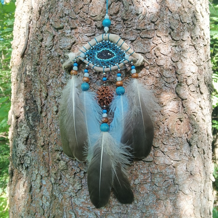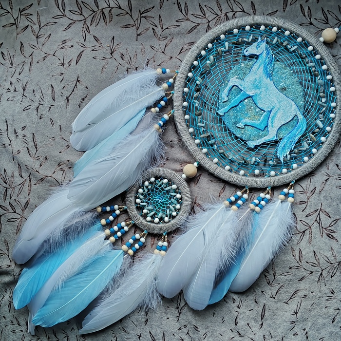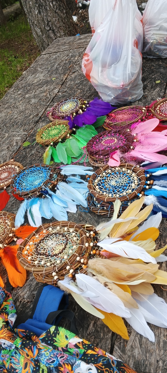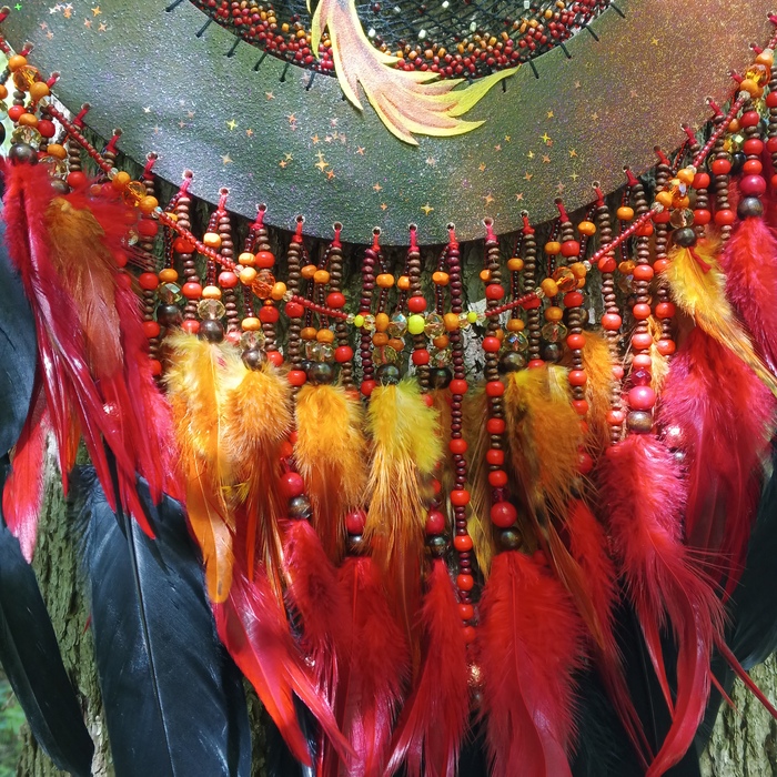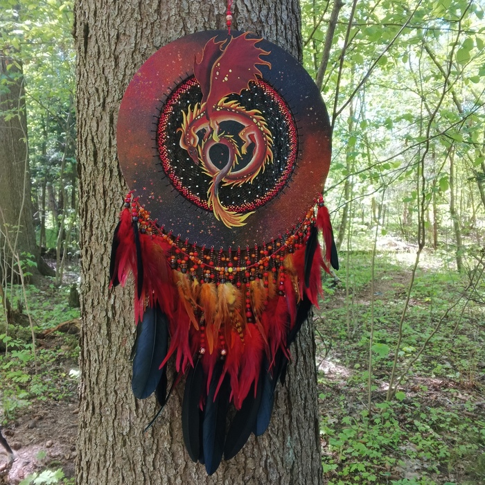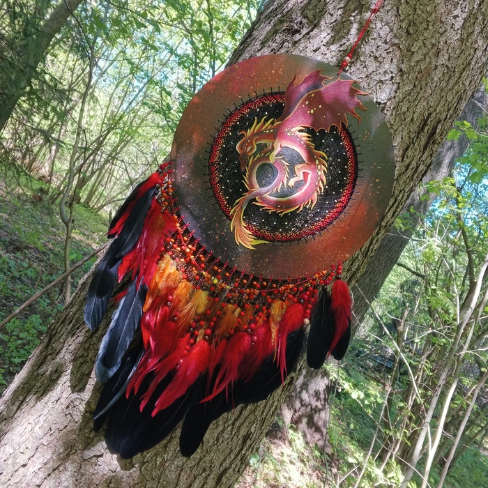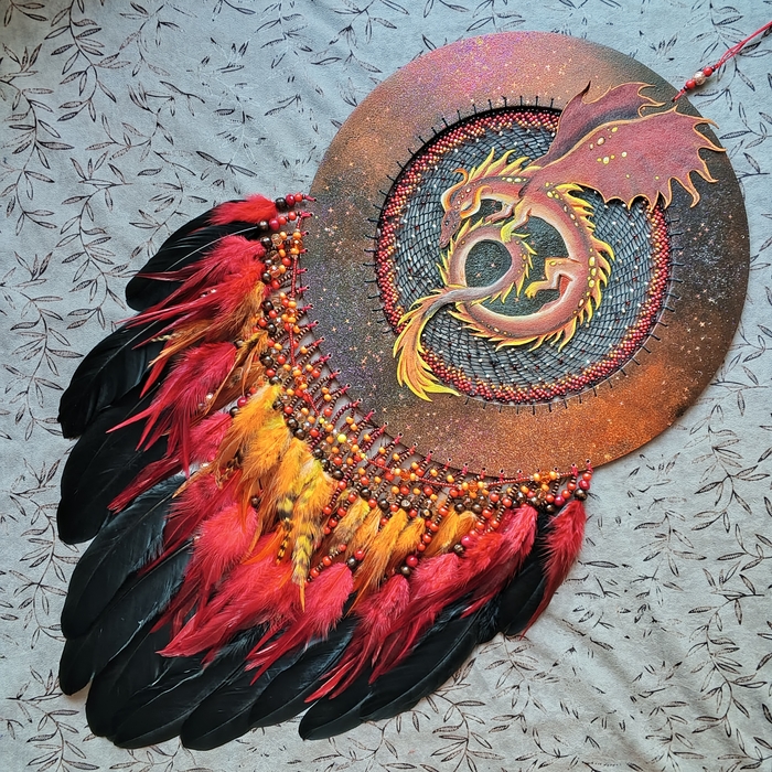 Длина ловца снов 74 сантиметра, диаметр верхнего круга 34 сантиметра. Основа из дерева, обмотка пряжей. Рисунки в центре сделаны вручную, роспись по фетру.