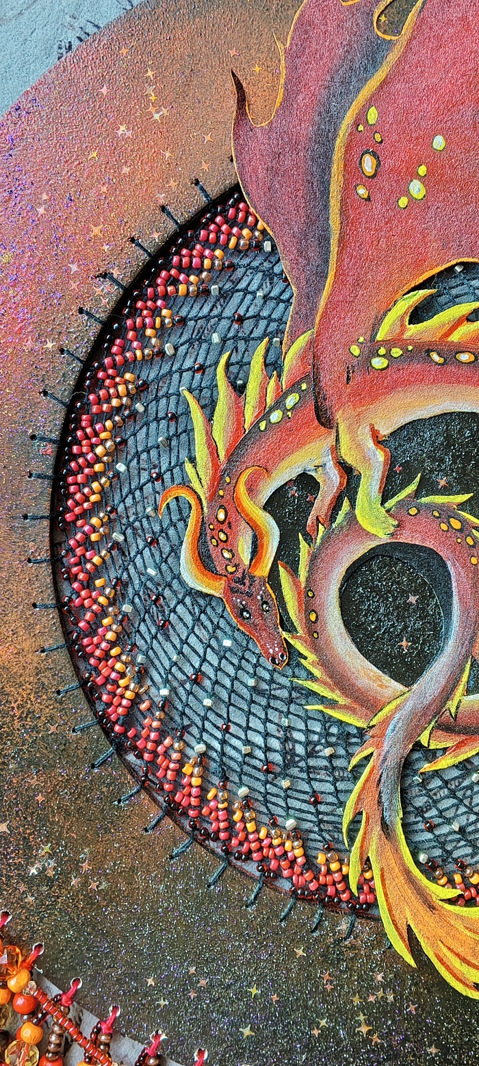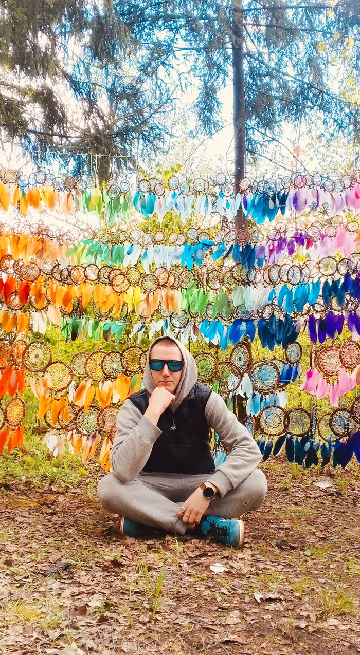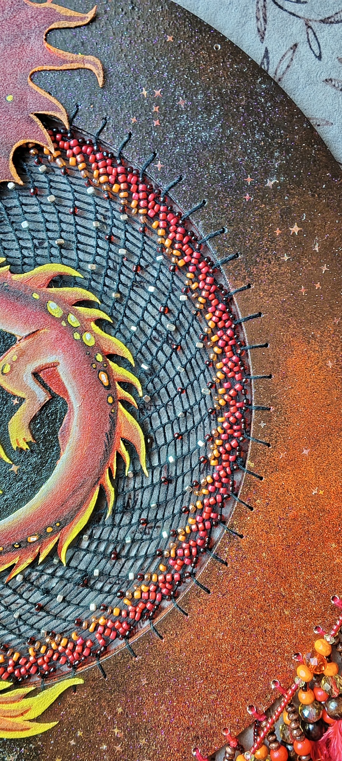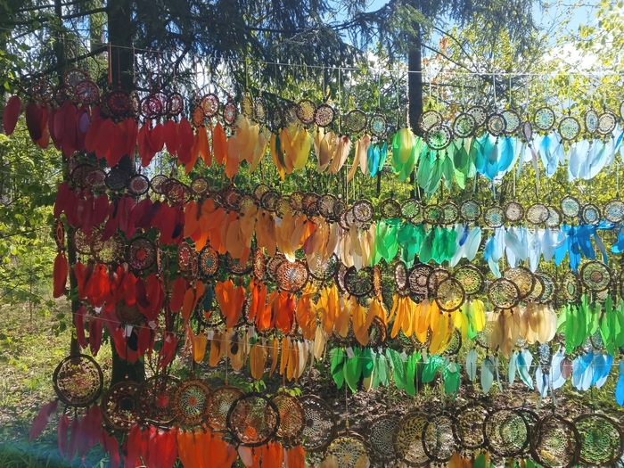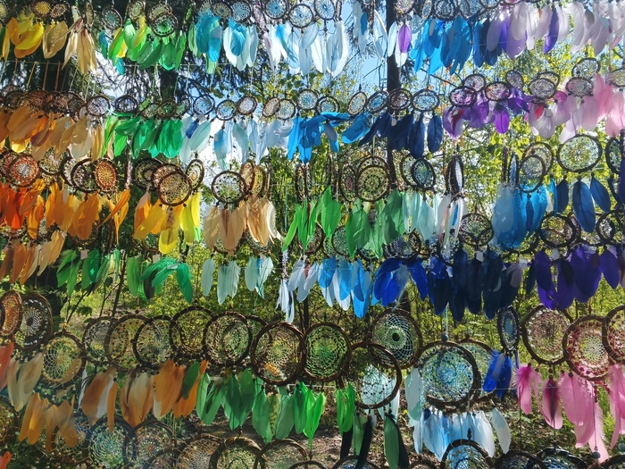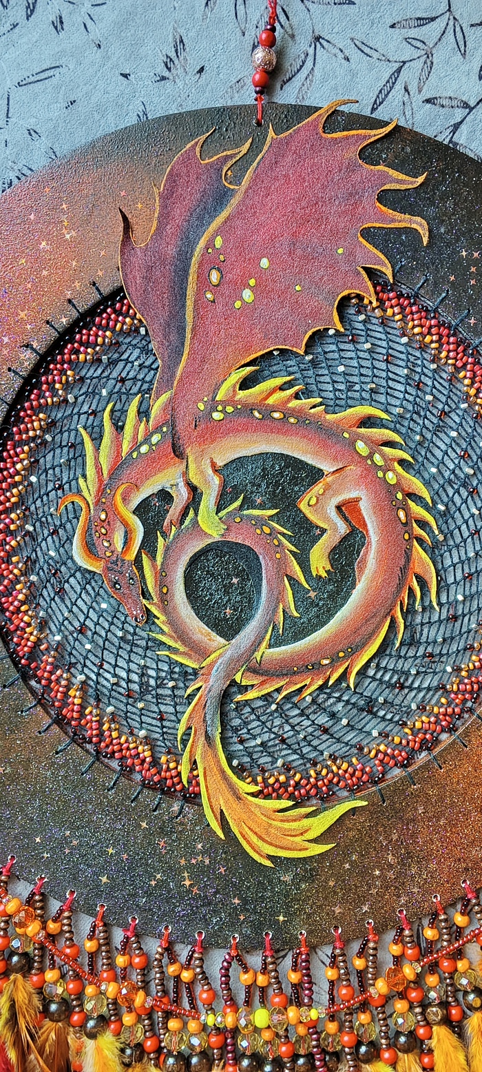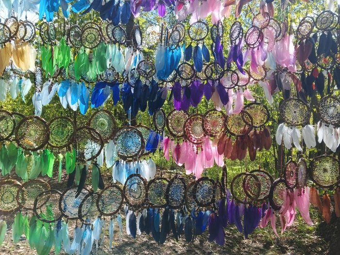 Длина ловца снов 74 сантиметра, диаметр верхнего круга 34 сантиметра. Основа из дерева, обмотка пряжей. Рисунки в центре сделаны вручную, роспись по фетру.