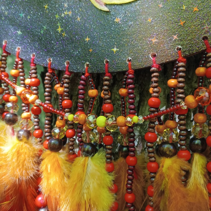 В плетении использованы деревянные бусины и бисер. Перья гуся, тонированные в разные цвета.