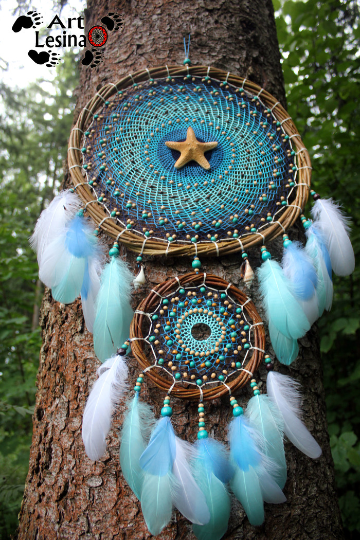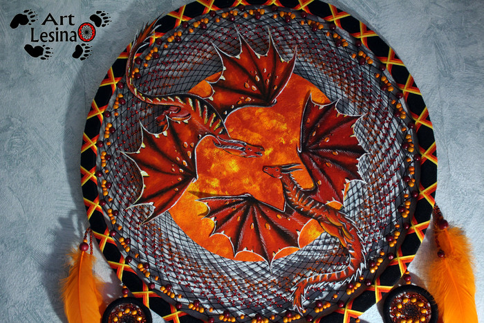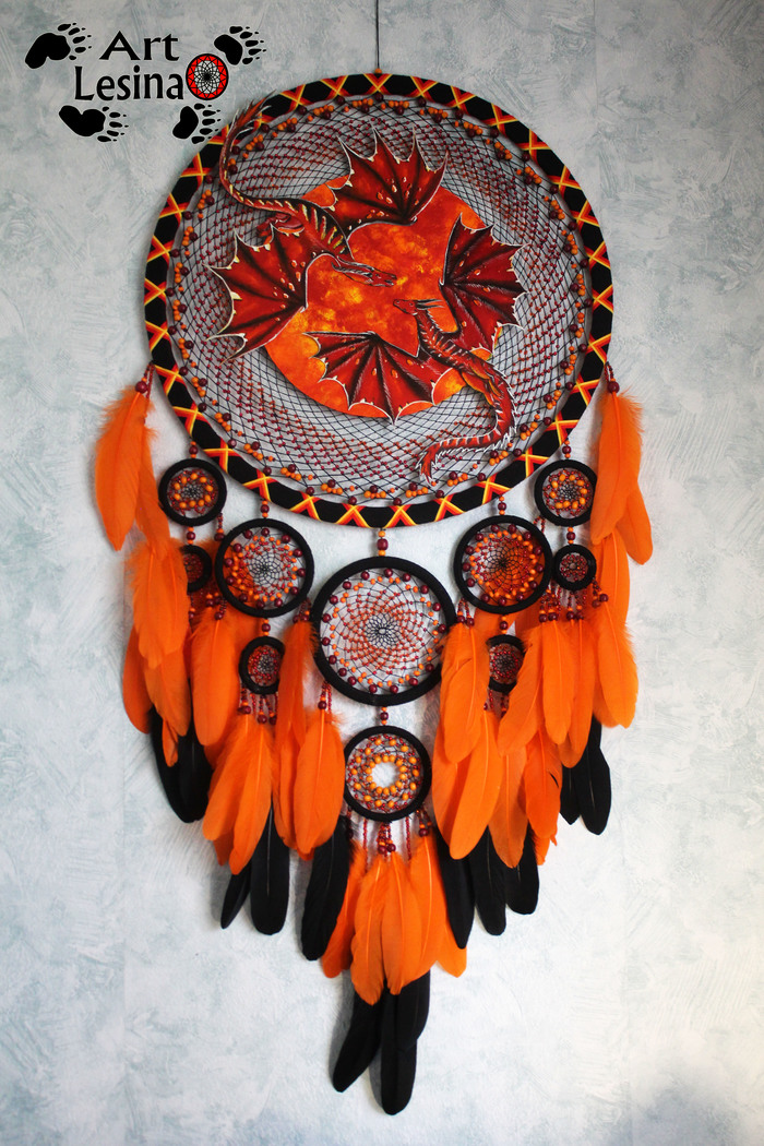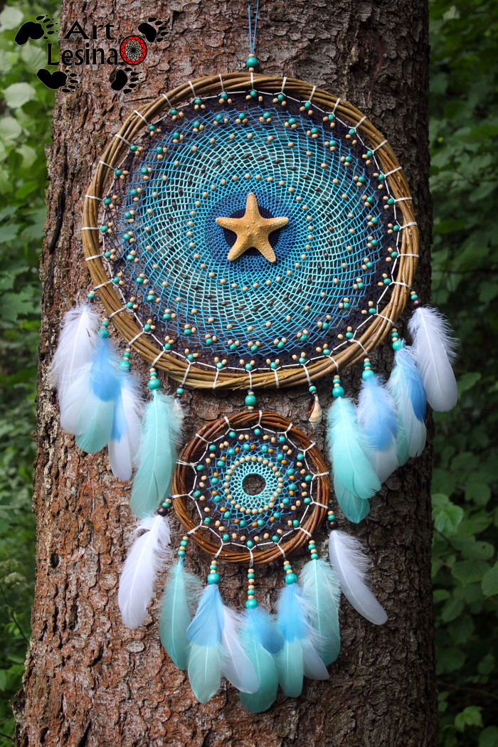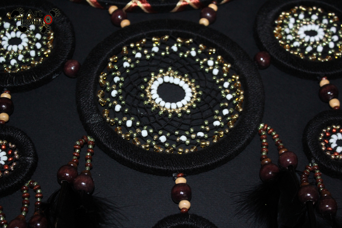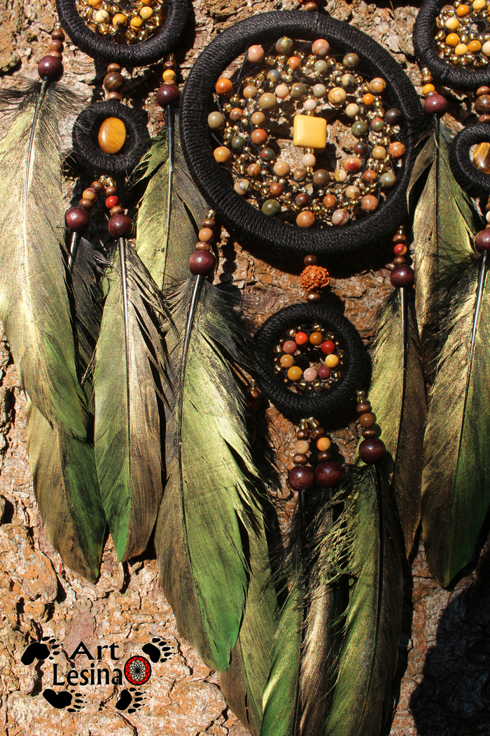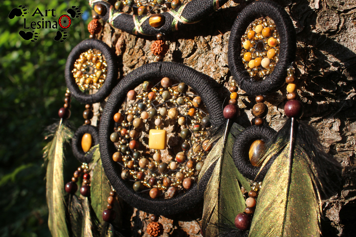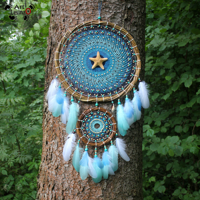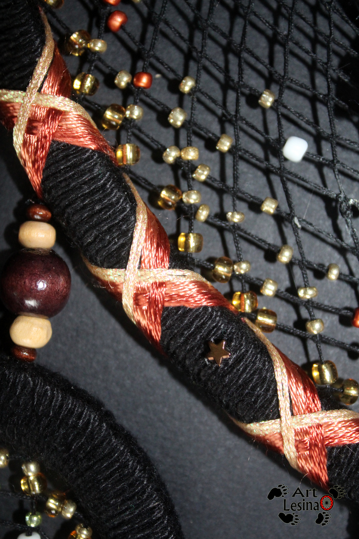 Длина ловца снов без учета подвесной веревочки 72 сантиметра. Диаметр колец 30, 12, 8 и 4,5 сантиметров.