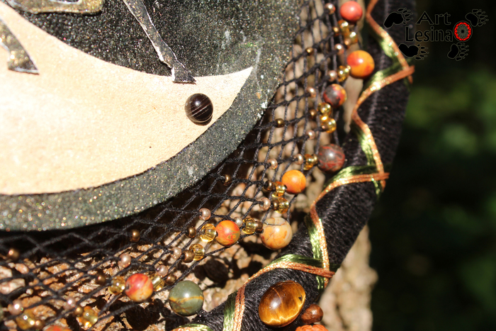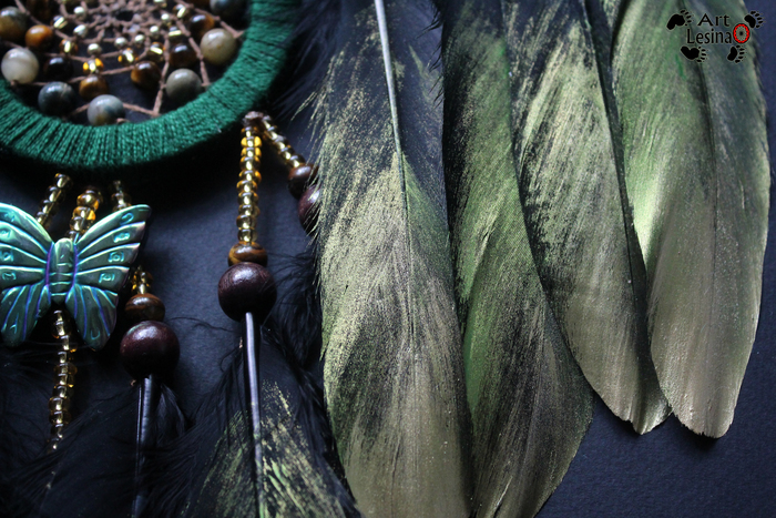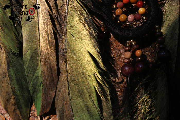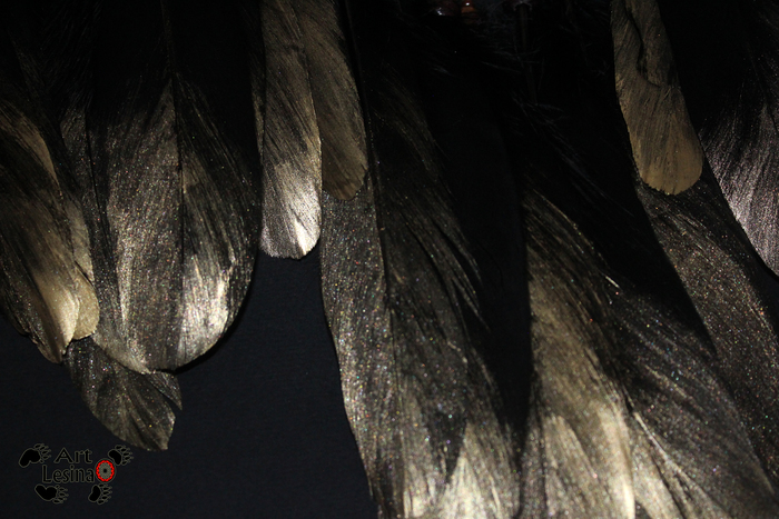 Перья гусиные, покрыты краской с металлик-эффектом. Волк и луна сделаны из ткани, небо из холста.