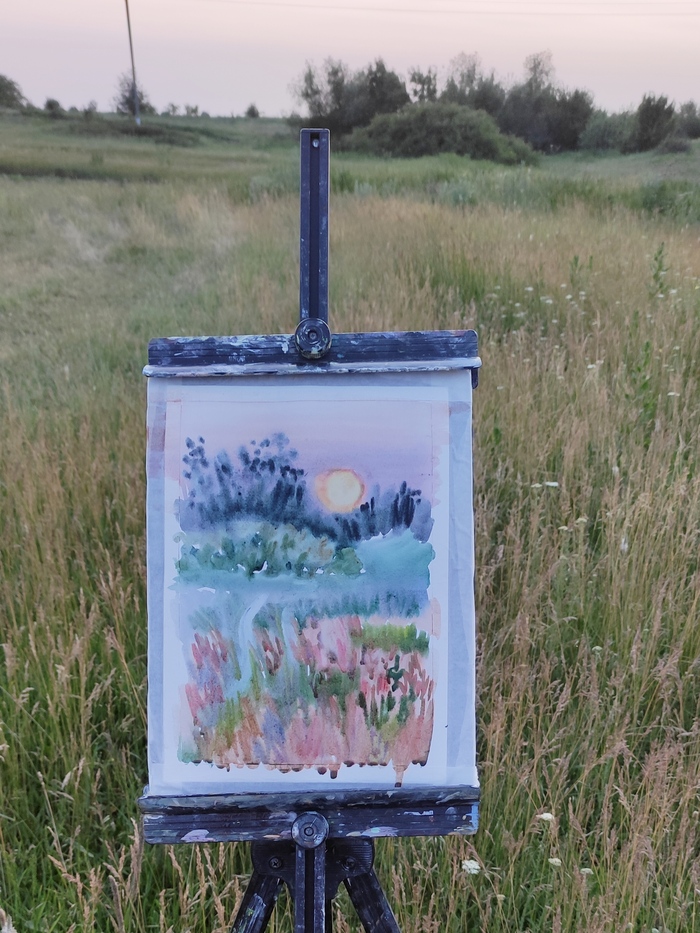 Вдохновлённая фильмом про импрессионистов, поняла, что не стоит упускать моменты — река и закат были прямо перед глазами. Этот этюд передаёт тёплый свет, розово-фиолетовую дымку неба, охристо-розовые травы и кроны деревьев. 🌾🌳