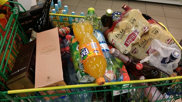 Типичная картина из серии "бери еще коньяка, чтоб другим не достался". Да да, люди там закупались как в последний раз))) Причем, как видите, тупо кидали все, что видели на полках.