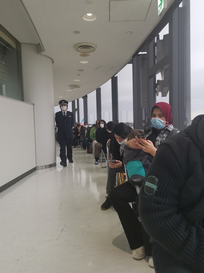 Вызывали, зачитывая на японском номера, приклеенные на паспорт. Наверняка тех, кто прослушал или не знает как звучит их номер находили ответственные по залу и приводили под руки.