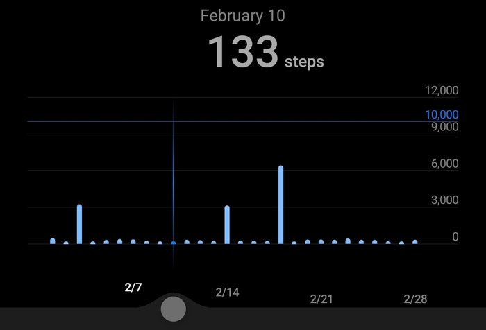 Шли дни, а я всё думал, что всё-таки тоже хочу получить достижение и нужно начать хоть какую-то тренировку жира в организме. Ну... была ни была, надо идти. Хотя бы до холодильника и обратно, стараясь по пути не открыть его. Так мои средние достижения месяца увеличились аж до 700(!) шагов день. (Да, да, это из за тех трех пиков на графике ниже, я тогда сходил в магазин)
