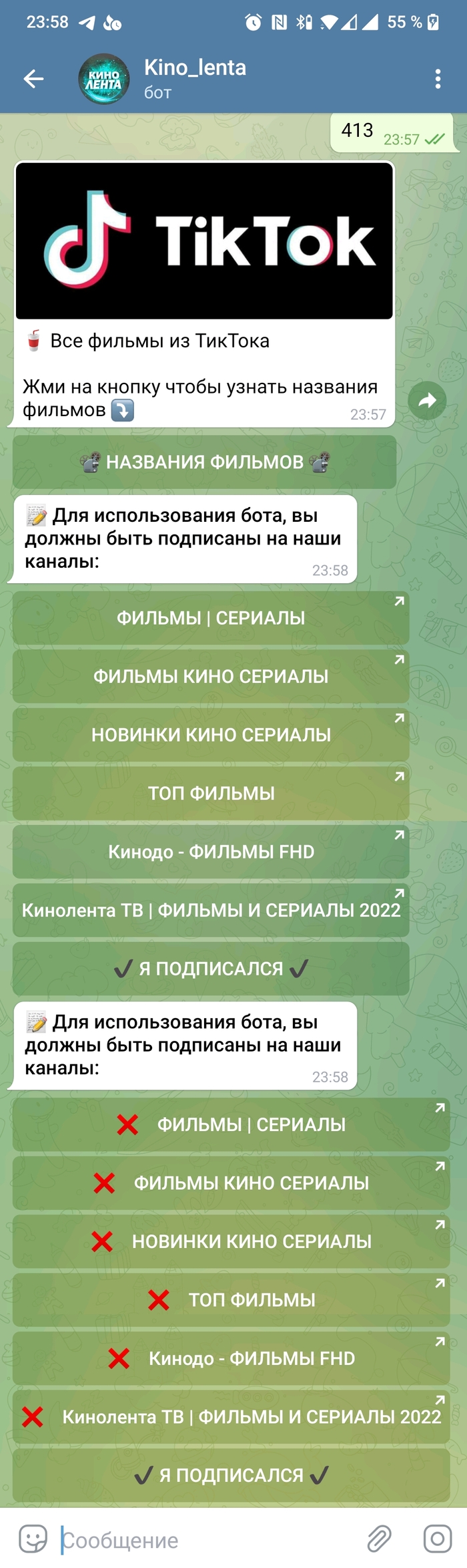Вы думали это конец? Нееее, мы же явно имеем дело с гениями клиентоориентированности. После нажатия на кнопку видеокамеры нас перекинуло в бота. Уже тупо любопытно до чего это все дойдет. Присоединяемся к боту и пишем ему 413. И в ответ тишина. Бот настоятельно требует подписаться на все их шесть, сраных, каналов, чтобы узнать название одного сраного фильма. На этом момент моя крыша дала сбой и я опять начал бухать