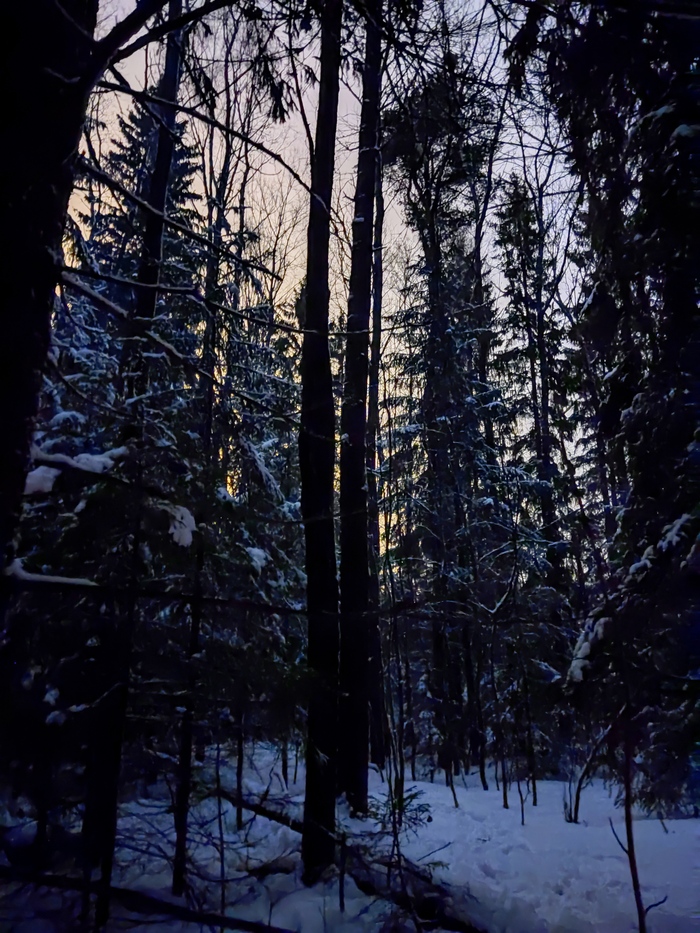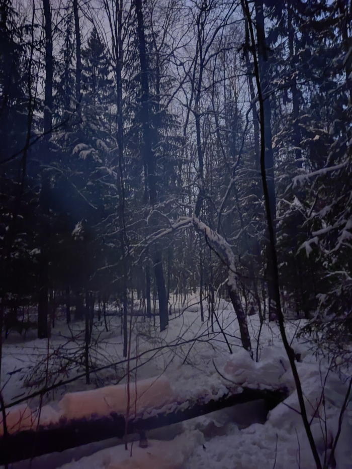 Не знаю, сколько мы продирались сквозь бурелом, канавы вынуждали петлять, двигаясь к берегу в обход, по диагонали, до кучи мы вышли на лосиную тропу, заваленную характерными кучами через каждый шаг и зловеще обтесанными стволами, о которые явно не раз чесали, надеюсь, что рога. Но, увы, другого пути не было. Я просто надеялась, что не войду в потёмках за какой-нибудь очередной елью во внезапный лосиный зад. Свет фонаря, то и дело выхватывал из темноты причудливые формы пней и корневищ поваленных деревьев, лишний раз раззадоривая фантазию. Оставалась надежда, что собаки всё же вспугнут зверя раньше, чем он вспугнет нас. Ну, или моё злобное пыхтение и треск веток..