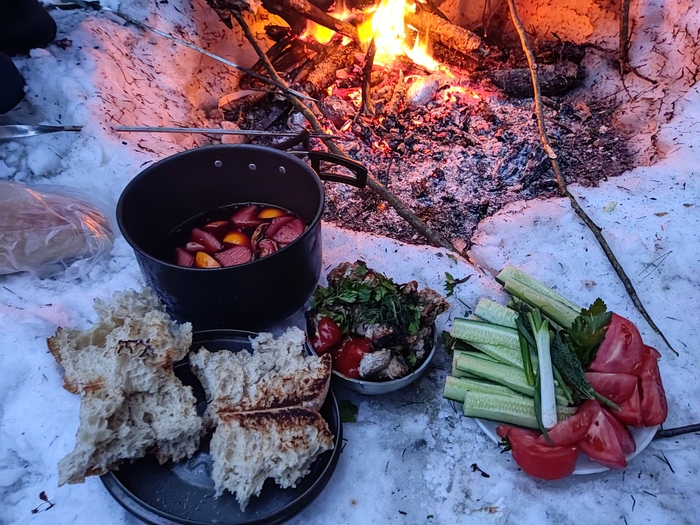 Меню было походно-праздничное, никаких сухпайков и макарон с тушёнкой, ещё успеем ими наесться: похлёбка на бараньей косточке, томившаяся на углях всю ночь, по утру, да со свежей зеленью - то что доктор прописал! Мясо пошло в плов, на ужин - шашлык из свинины. Корейка на камне, печёный картофель, овощи, свежепойманная рыбка, мммм..