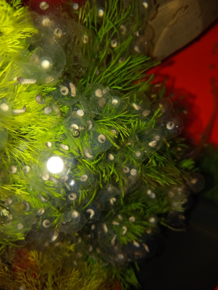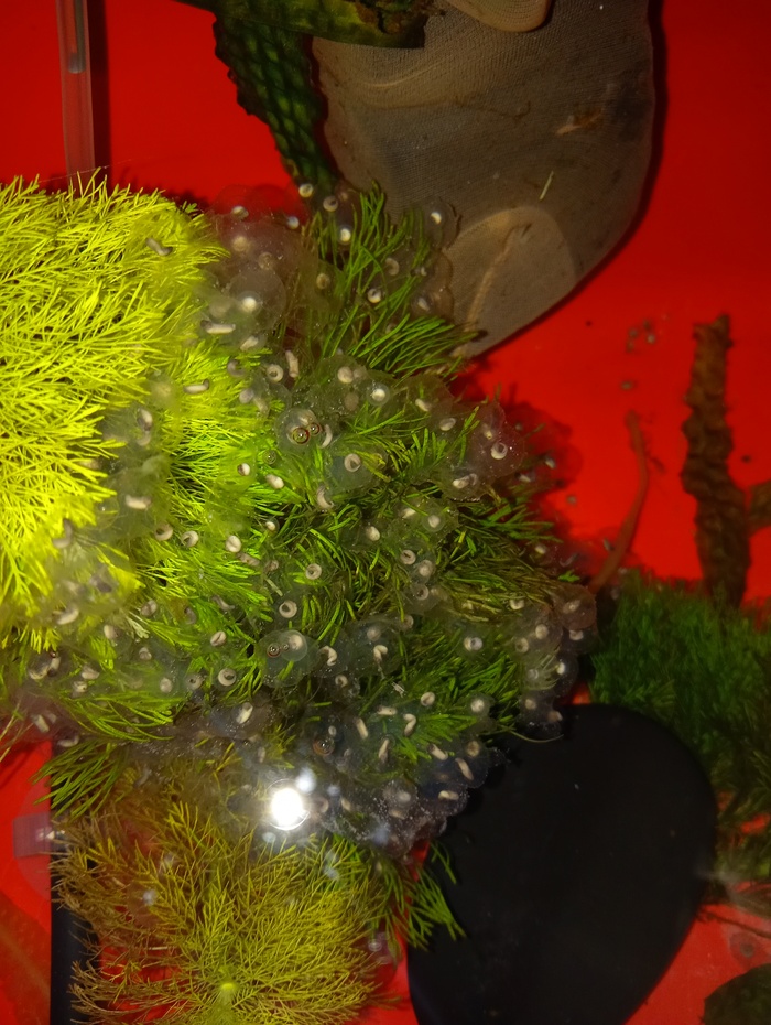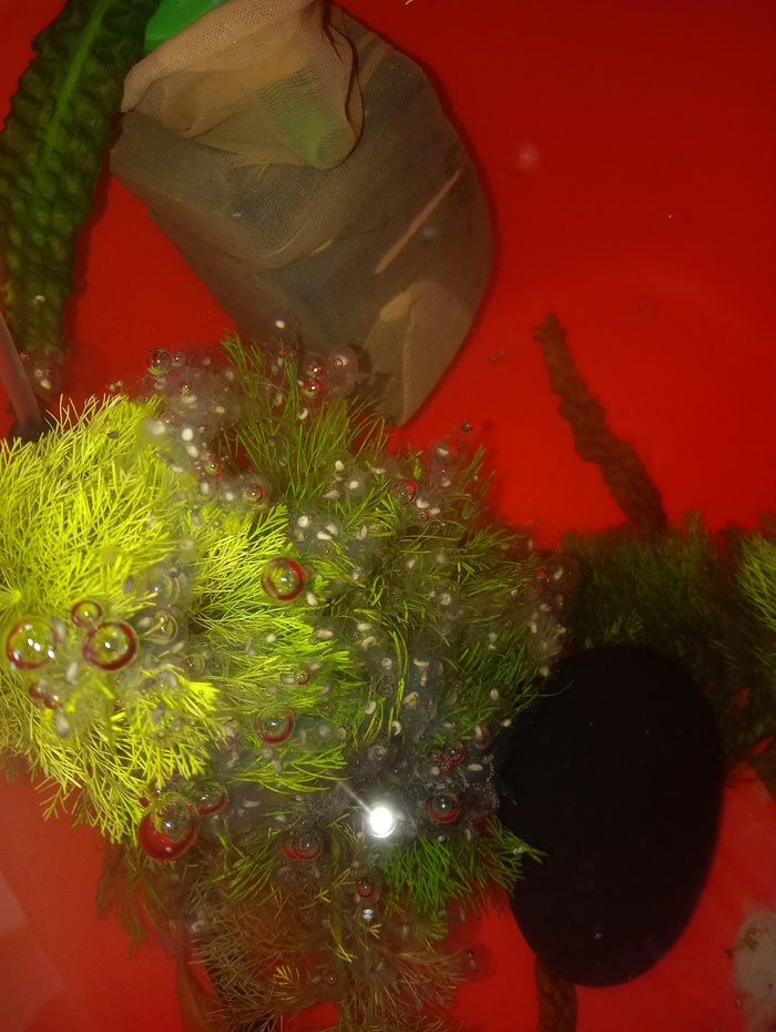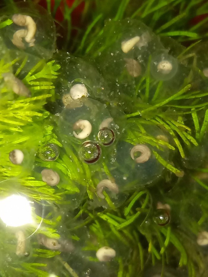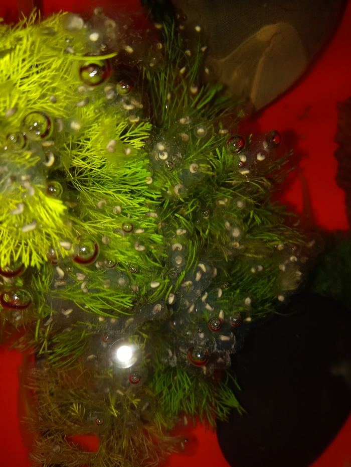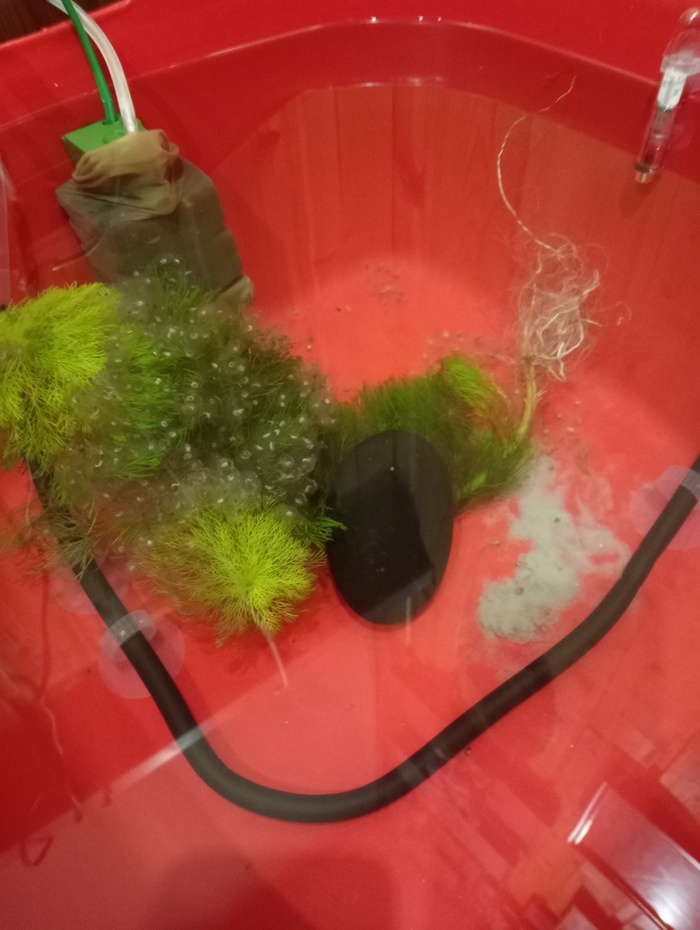 И это прекрасный день, чтоб заняться уборкой отсадника. На фильтре я увидела, что мелкие частицы грязи прилипли на сам носок. Это лучше, чем собирать их по аквариуму, поэтому лайфхак не сильно, но рабочий. Сняла мутные икринки (3 штучки, как и было, новых вроде бы не нашла) вот фоточка поближе.