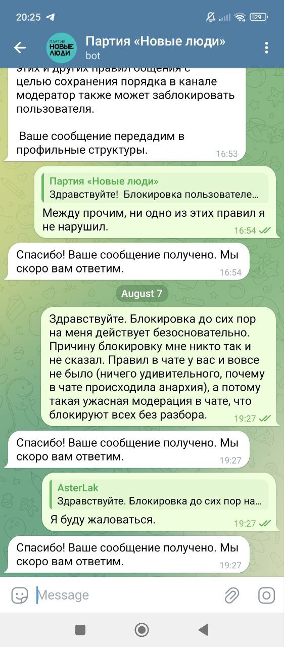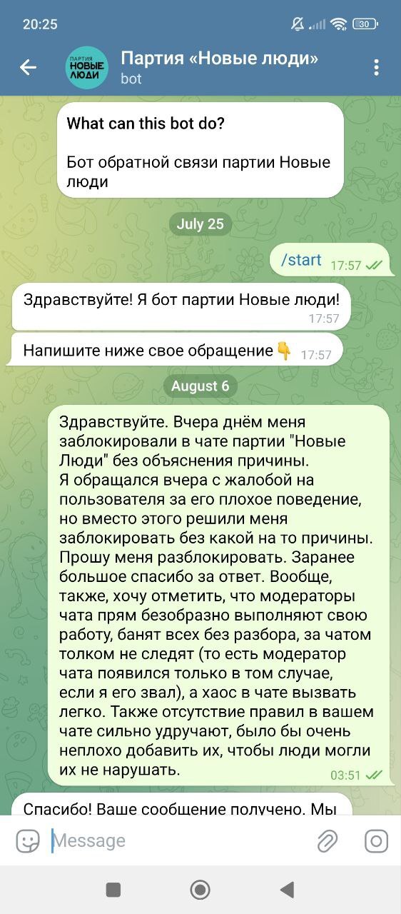 P. S. Во время первого бана обращался к боту ТГК партии "Новые Люди". Толку ноль оказалось (просто проигнорировали). Скриншоты приведены ниже (смотреть скриншоты также от низа к верху):