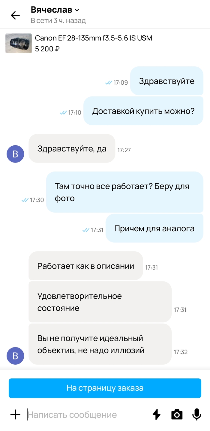 Сидел на авито, починял примус, решил купить стекло для старого пленочного кэнона. Пока осень, можно и пофоткать. Увидел объявление, что некто Владислав продаёт старое стекло 28-135. Объяву он уже потер, так что скрина не будет. В ней он пишет, что стекло рабочее, но стаб для видео не подходит. Мне, если честно было фиолетово. Я ж на пленку снимаю и исключительно портретики. Цена тоже норм. Не прям супер, за полурабочее стекло, но и не за запчасти. Пишу уважаемому Владиславу, могу ли данный товар доставкой от авито купить, на что продавец конкретно отвечает, что конечно можно. Думаю спросить, точно ли все работает, как в описании. На что Владислав говорит, что стекло и так стоит сущее ничего. Спрашиваю, что там по плесени и разборке, продавец с ходу превращается в дикобраза и говорит, данные вопросы его не интересуют. Я его заверяю, что меня все устраивает, главное чтоб все работало, как указано, не было плесени и разборки (видали мы стекла после разборки молотком в домашних условиях). После чего продавец резко переобувается, говорит что готов только на предоплату, и вообще там "Битый развод вскрывали, царевны есть плесень". Не поняв, что именно он хотел сказать заказываю стеклолостмвкой, на котрую продавец был согласен, в надежде посмотреть где там спряталась царевна с плесенью и какой развод он вскрыл. Владислав с ходу просит оставить отзыв. На что я отвечаю, что обязательно это сделаю после получения товара. Но продавцу пофигу. Он меня уже в игнор добавил. Поняв, что отправлять товар никто не будет, отменяю заказ. И через две недели получаю отзыв, что это я редиска такая, знал мол что стекло мне не подойдет, но сам его заказал, а еще общался "неудовлетворительно". Внимание, вопрос @@Avito.help Где уважаемый продавец сказал, что товар мне не подходит? Пытался раз пять оспорить, но авито утверждает "Все так и было. Отзыв не удалим". В конце на скринах немного о других отзывах Владислава.