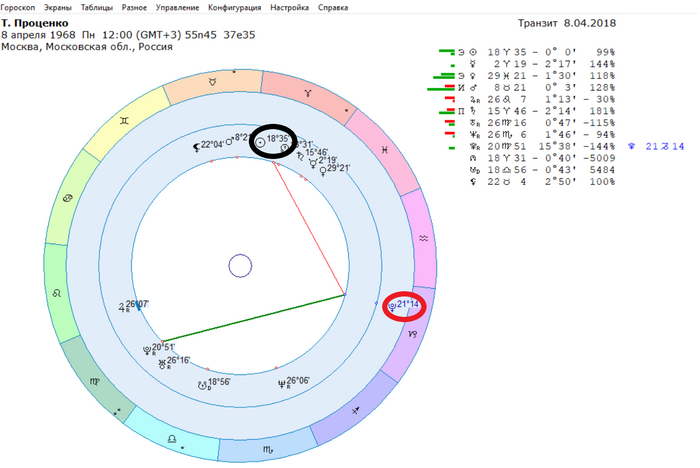 Итак, переходим к просмотру. Транзитный Сатурн будет в красном кружочке, Марс натальный – в черном.