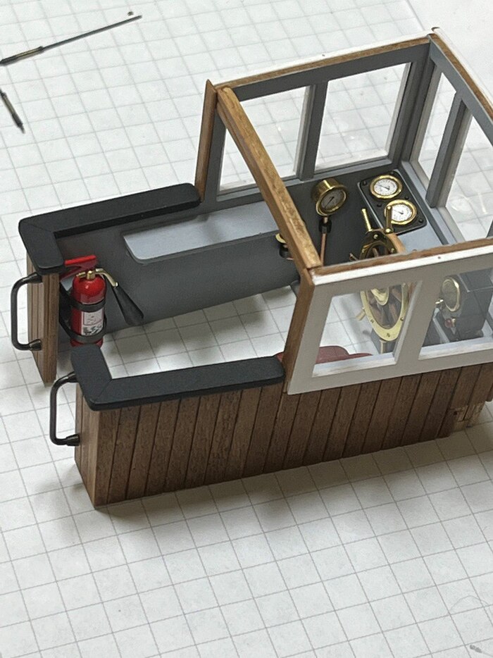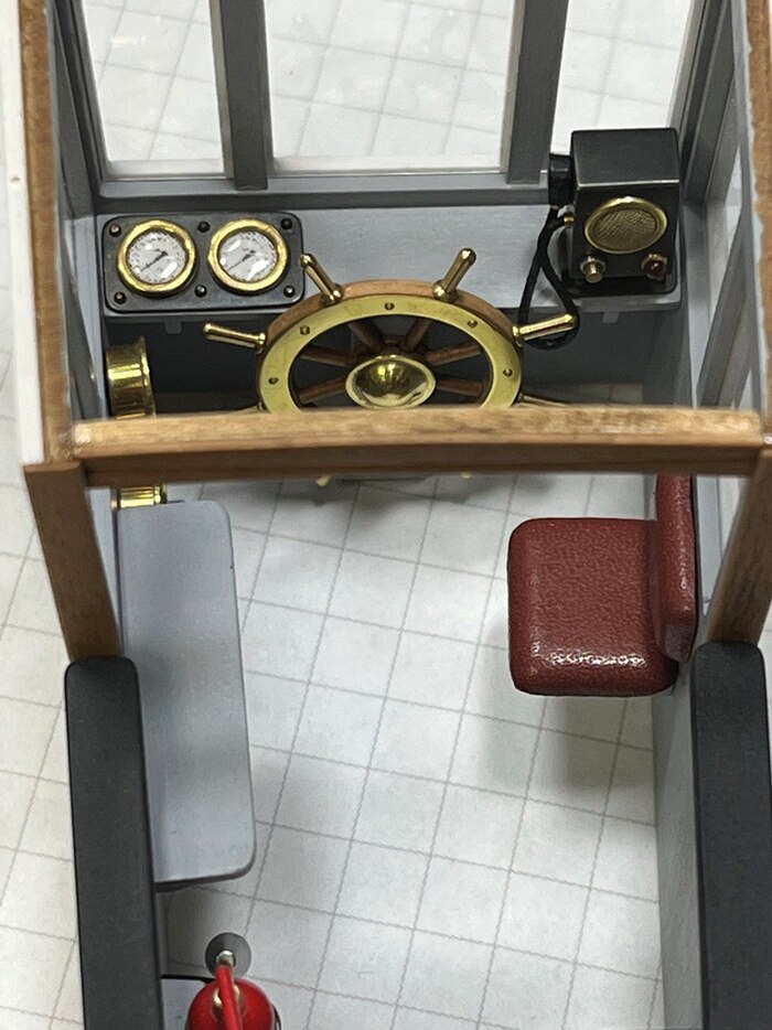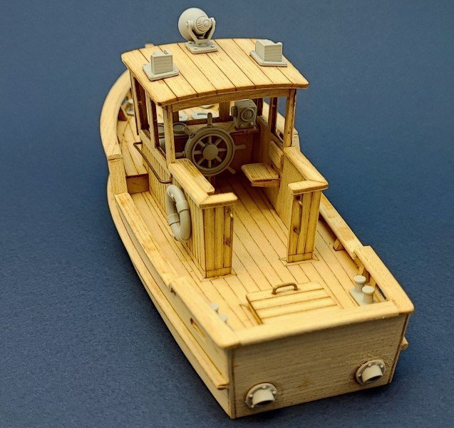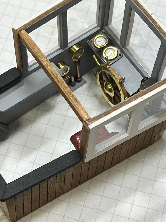 Обшивка палубы и бортов изнутри из реек груши, грушей обшил рубку снаружи и другие надстройки. Все пластиковые детали интерьера заменены на дерево и латунь, оргстекло.
