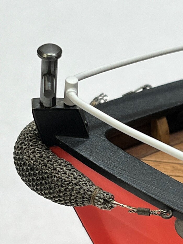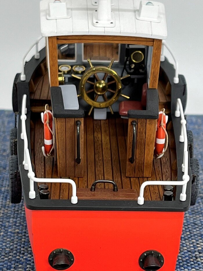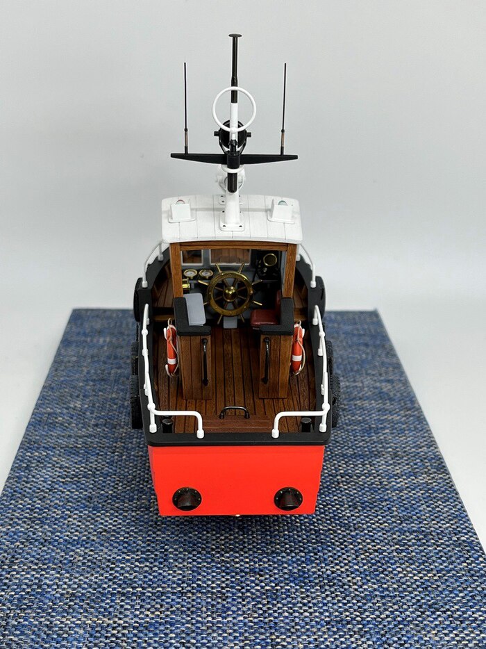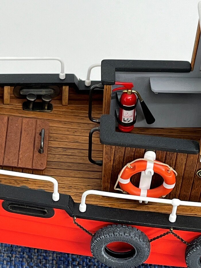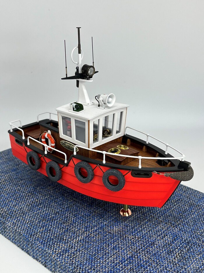 Переделал - кнехты, выхлопные дюзы, клюзы, приборы в рубке, радиостанцию, огнетушитель, штурвал, спасательные круги, сиденье обтянул кожей, навигационные огни, громкоговоритель, добавил по бортам поручни, на крыше установил небольшую мачту вымышленной конструкции с прожектором и антеннами. На носу имитировал мягкий кранец на тросе, «остеклил» рубку, по бортам на цепях навесил покрышки. Окрашивал аэрографом, акриловыми красками, открытое дерево покрыто тунговым маслом. Назвал его «Сириус», в честь путеводной звезды, раз уж он лоцманский😁 (табличка травлением поваренной солью и зарядкой от телефона).