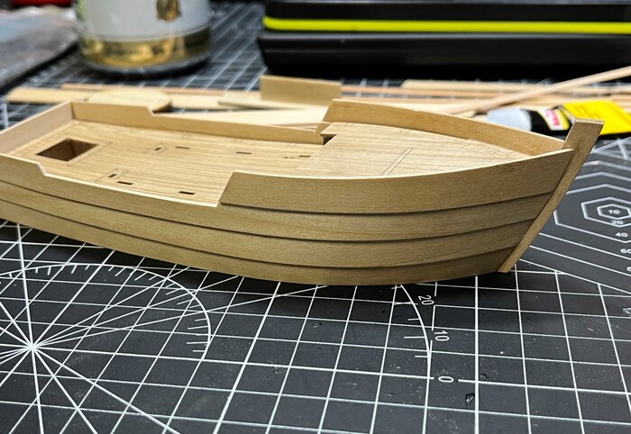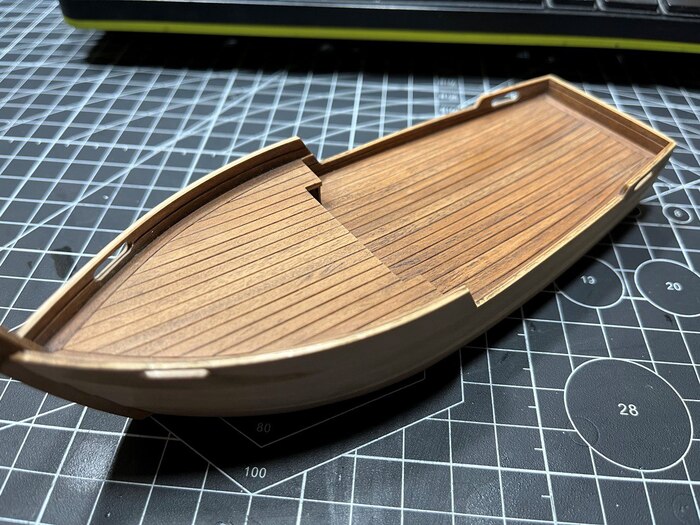 Штатные цельные листы бортов выгнуть не получилось, делал несколько подходов с водой, но все детали повело, даже с аммиаком и утюгом все равно образовывались щели. Все это дело бросил и сделал клинкерную обшивку из реек липы.