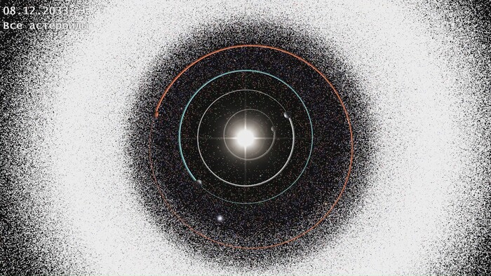 В этом видео вы можете наблюдать смоделированный пояс астероидов. Если в предыдущем видео показывались только 83 тысячи крупнейших астероидов, то в этом удалось изобразить все известные астероиды. Таким образом, каждая движущаяся точка на экране – это один из почти полутора миллионов астероидов. И каждая из этих точек движется по вычисленной траектории, соответствующей реальной орбите астероида.