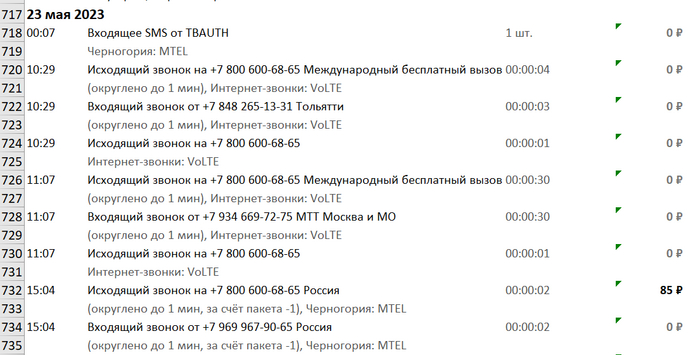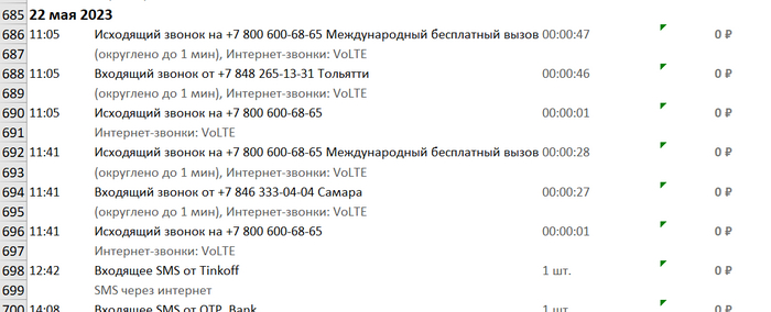 22 мая - в 11.05 сразу ТРИ паралельных звонка - входящий и исходящий в одно и то же время. в 11.41 еще три звонка - 2 исходящих и 1 входящий.