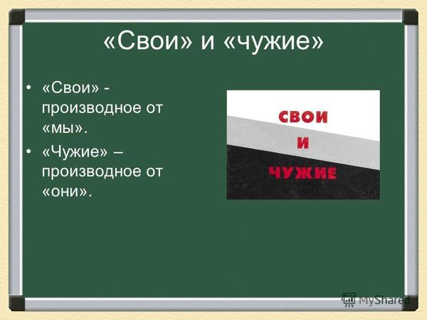 3. Биполяризация мира. Происходит внедрение в сознание человека установки, что все люди делятся на СВОИХ и ЧУЖИХ, ХОРОШИХ и ПЛОХИХ, ПРАВИЛЬНЫХ и НЕПРАВИЛЬНЫХ. При чём основания или критерии разделения варьируются от биологических до религиозных и политических. По принципу: "Кто не с нами - тот против нас". Иногда выделяется ещё и серая масса, которая ничего не понимает, всего лишь послушная паства ЧУЖИХ. Эти вообще не люди ОВОЩИ.