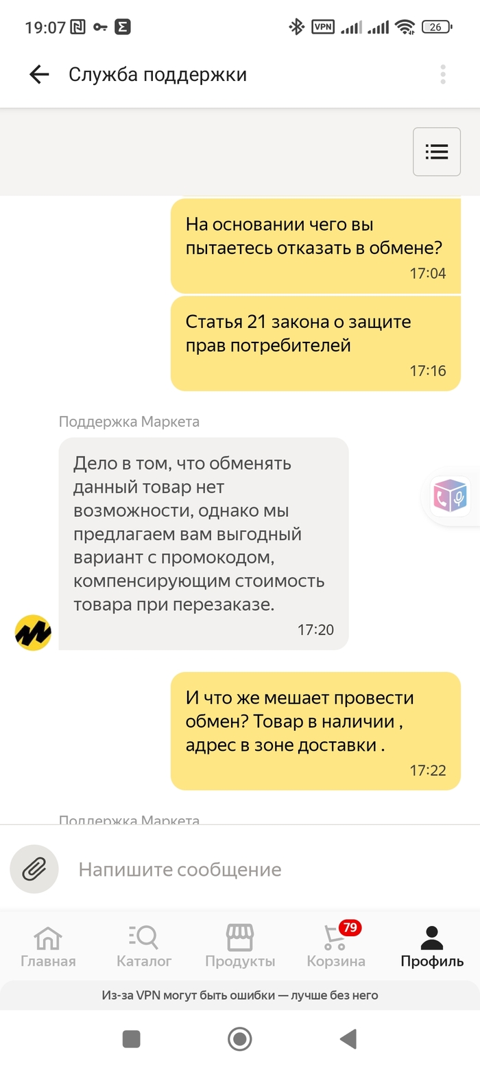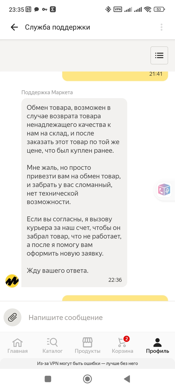 При этом продавец товара ООО "Маркет.Трейд", т.е. сам Яндекс. И, внимание! Поддержка Яндекса сообщила мне, что маркет будет договариваться с продавцом об обмене товара и, если тот согласится, то такую возможность рассмотрят.