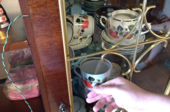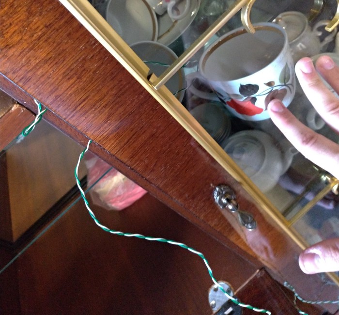 Продеваем шнур через ручку кружки и придерживаем дверку рукой.