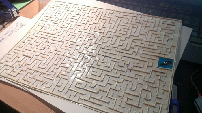Сверху лабиринт покрыт стеклом с отверстием для металлического шарика (с другого конца от замка), а стекло покрыто чистым листом А3( с дыркой под шар и окошком,показывающим замок под стеклом для понимания конечной цели) и все собрано обратно в корпус фото-рамки.