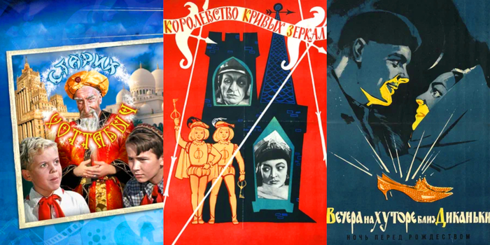 1) Художественный фильм-сказка «Старик Хоттабыч» снятый на киностудии «Ленфильм» в 1956 году по мотивам одноимённой повести Лазаря Лагина. 2) Полнометражный кинофильм «Королевство кривых зеркал» снятый на киностудии им. М. Горького в 1963 году по одноимённой повести писателя Виталия Губарева. 3) Цветной кинофильм «Вечера на хуторе близ Диканьки» снятый на Московской киностудии им. М. Горького в 1961 году по повести Николая Васильевича Гоголя.