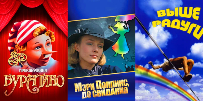 10) Музыкальный кинофильм «Приключения Буратино» снят на киностудии «Беларусьфильм» в 1975 году по мотивам сказки Алексея Толстого. 11) Детская кинолента «Мэри Поппинс, до свидания» снята киностудией «Мосфильм» в 1983 году по произведениям Памелы Трэверс о Мэри Поппинс. 12) Художественная кинолента «Выше Радуги» снята в 1985 году Одесской киностудией по заказу Гостелерадио СССР в Таллине (Эстонская ССР).