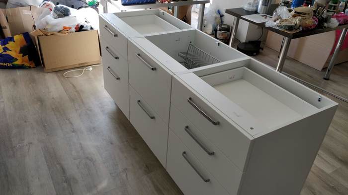 Спецы хотели сделать так, а над ящиками (серыми) положить дополнительно белую доску. Представляете колхоз? Подумав сказал им делать по другому, опускать всю полку (на высоту 1 доски) и крепить немного ниже к пеналу. (шкаф слева)