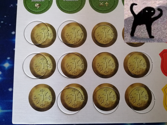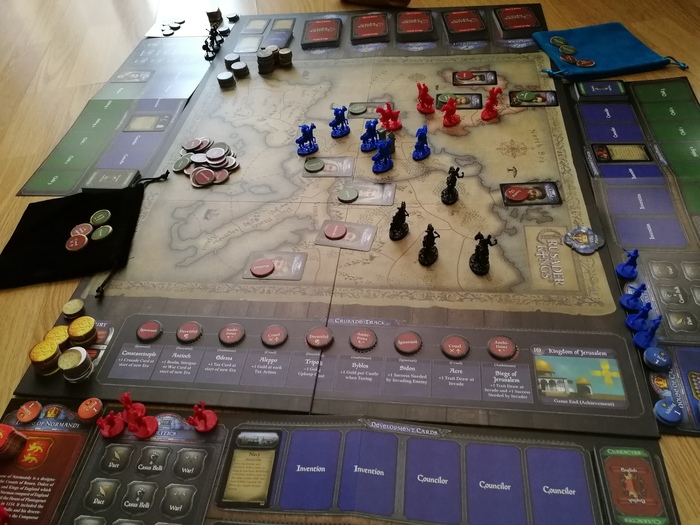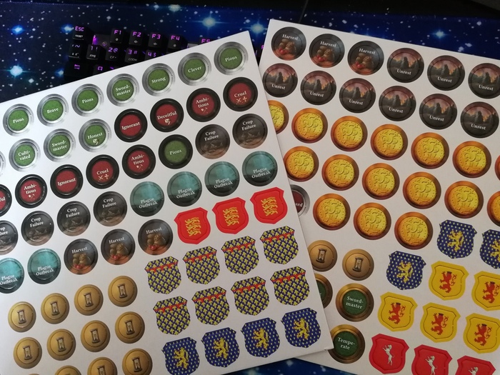 Соответствуя духу Крестов, в игре присутствует приличное количество жетончиков и карт с чертами, событиями, модификаторами, персонажами и их династическими гербами.