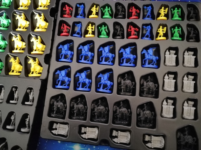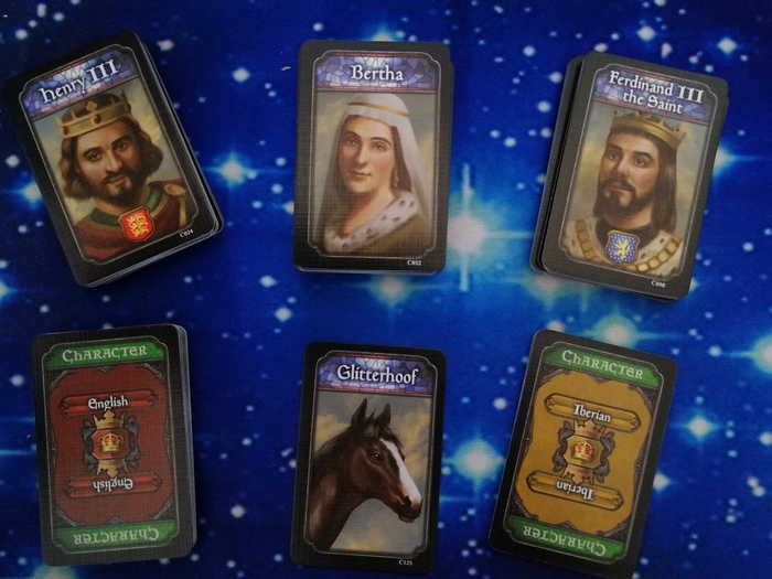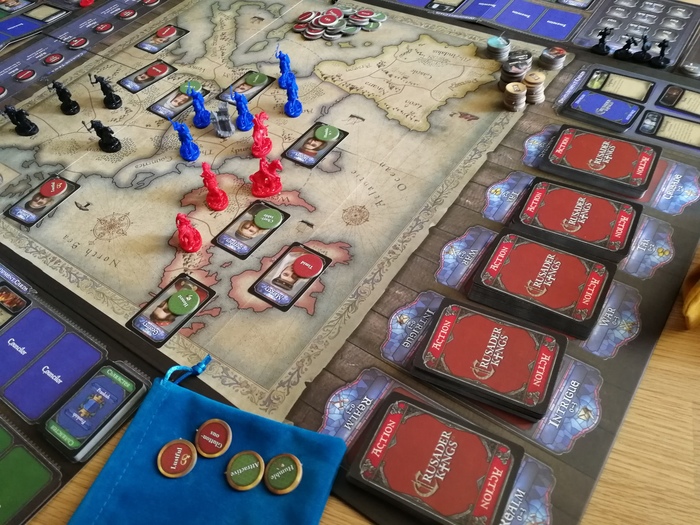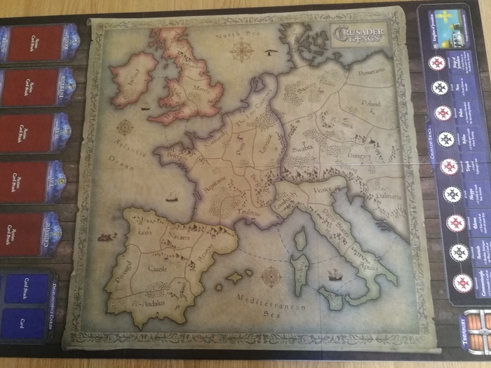 Примерно так выглядит игровая доска, подготовленная на трех человек. В данном случае на Испанию и Италию игроков не хватило, и тем самым эти территории исключаются из игры (что в принципе логично). Рыцари разного цвета играют роль подконтрольных игроку вассалов, иначе говоря - владения игрока; а разбросанные по провинциям карты персонажей - независимые владения, с этими персонажами можно посвататься или же дубинкой им по шапке дать, если экспансионистский голод чрезмерно одолевает, а кишка слишком тонка, чтобы на другого игрока нападать.
