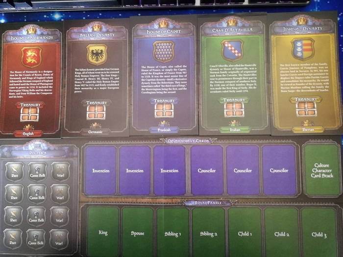 В игре 13 династий на выбор (на картинке 5 штук сверху) и 5 династических панелей для каждого из игроков (снизу на картинке), где размещаются все карты: короли/королевы, их семьи, советники и изобретения.