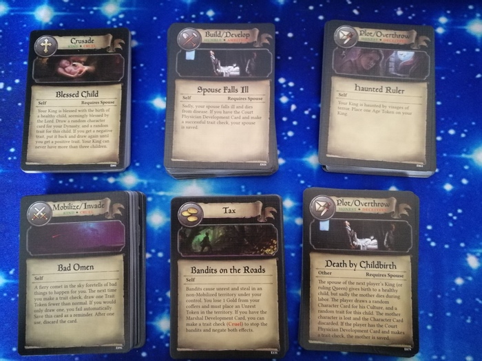 Карты действия, как можно понять из названия, отвечают за события и бывают 5 типов: Крестовый поход, Строительство/Развитие, Заговор, Мобилизация/Вторжение, Налоги. Всего таких карт 155 штук.