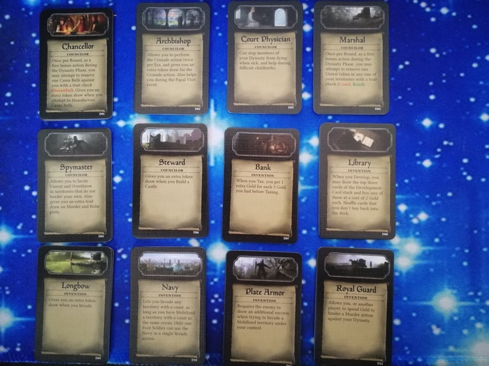 Карты развития. 24 шт., по паре карт каждого типа. По сути представляют собой советников из Crusader Kings 2, плюс еще несколько других нововведений, делающих игру чуть более разнообразной.
