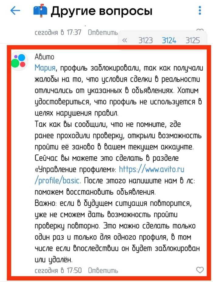 Полгода сижу в их группе, профиль восстановить невозможно, подключили ботов, которые отвечают шаблонами не по теме. Просидел с февраля до июня в их группе, потому как отвечают раз в 5 дней. Толку абсолютно нет от их техподдержки. И вот наконец спустя 4 месяца договорился о том, что к профилю привяжут новый номер, купил новую симку, назначили звонок через 2 недели. Раньше видать у них невозможно, жду 2 недели, позвонили, подтвердили. При входе в профиль снова заблокировали, проверку по биометрии прошел, но паспорт теперь не подходит им. Собрали биометрию и персональные данные и заблокировали аккаунт. Это мошенничество, по другому это не могу назвать. Теперь чтобы удалить свои персональные данные нужно ещё сидеть полгода вести переписку с ботами, поскольку живые люди не отвечают. Буду максимально распространять в интернете информацию об этих мошенниках, чтобы другие люди не отправляли им свои документы. Так же я занимаюсь скупкой разной техники, в день около 5 покупок делаю с профиля жены. Очень часто когда товар стоит ниже рынка через минуту буквально "Товар зарезервирован". Звоню и говорю, что еду с наличкой, отменяйте заказ. Люди не верят, что можно остаться без товара и денег, но это действительно так, потому что деньги потом можно выбивать полгода через ботов Авито, живые люди не отвечают, либо отвечают крайне редко такими же шаблонами копируют ответ ботов. Авито превратился в мошенническую организацию со сбором данных. Никто из моих знакомых и друзей не смог зарегистрироваться в этом году на Авито, профиль работает максимум 1 месяц, потом его блокируют и вымогают паспорт и биометрию, после прохождения проверки по паспорту снова блокируют профиль с формулировкой "мы не смогли проверить данные ваших документов, поэтому заблокировали ваш профиль, профиль заблокирован навсегда, вернуть доступ невозможно даже через поддержку" Кем они себя возомнили, это мы пользователи сделали таким этот сервис, неся им деньги. Я думаю таким образом недолго осталось существовать этому Авито, новых пользователей не прибавляется из-за этих проверок и ботов, а старых рано или поздно бот блокирует по любой причине, даже если у вас доставка оформлена. Тем самым они забирают деньги и блокируют профили , продавец месяцами не может получить деньги, так как через этих ботов невозможно пробиться до живых людей. Я не мог вспомнить в каком профиле прошел проверку по лицу, мне ответили вспоминайте или восстановить профиль невозможно будет. Но вот скриншот, где предлагают Марии пройти повторно проверку, даже если она забыла где проходила. Других же блокируют без разбора все новые профили, естественно я пробовал регистрацию на несколько номеров разных и почту, но все они были заблокированы на 2й день и я не помню уже ни номеров, ни почту. Возможно блокировки делаются намеренно, скорей всего у конторы есть иностранные корни и для этого собирают персональные данные пользователей и перепродают на черном рынке. Я еще не писал в приемную президента по поводу проверки этих мошенников на иногента, но обязательно это сделаю скоро. Каждый день буду распространять информацию в интернете и живым людям, покупателям, продавцам о мошеннических действиях Авито. Мне не сложно, потому что я каждый день что-то покупаю и продаю. Авито даёт регистрацию одного профиля на всю жизнь, смо