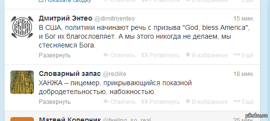 5 AzamatBogatov 11 лет назад Внезапное совпадение идущих подряд твитов в ленте новостей совпадения не случайны X (Twitter) Энтео Ханжество Совпадение