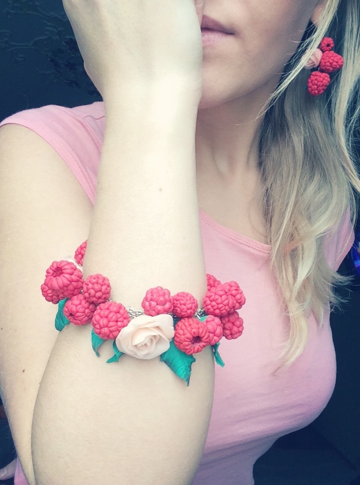 Далее была проба малины (в виде смешанной как попало опять глины) .. браслет и серьги, опять же, на мое удивление очень прочные, падали раз 10 и ничего.. хотя над техникой выполнения еще работать и работать.. делалось все опять же по памяти