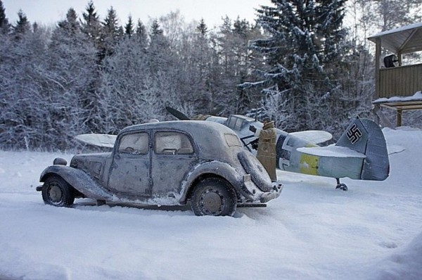 "Не желая расставаться со старыми работами, (некоторые из них несмотря на слабенькое исполнение мне все же самому нравятся) занимаюсь их переделкой, доработкой и делаю новую фотосессию. Эта работа уже была представлена на нашем сайте год назад Генерал Мороз. Но недавно решил занятся переделками. Старые фигуры были перенесены на другую работу (Генерал грязь) еще осенью, а для этой диорамы я приобрел новый набор часовых в тулупах от Драгона. Благодаря призам за победу в конкурсе на сайте "Навигатор моделизма" от магазина E2RD я стал владельцем Ситроена от Тамии, который и решено было использовать для оживления зимнего пейзажа. В качестве эксперимента при создании основания и сугробов использовал монтажную пену."